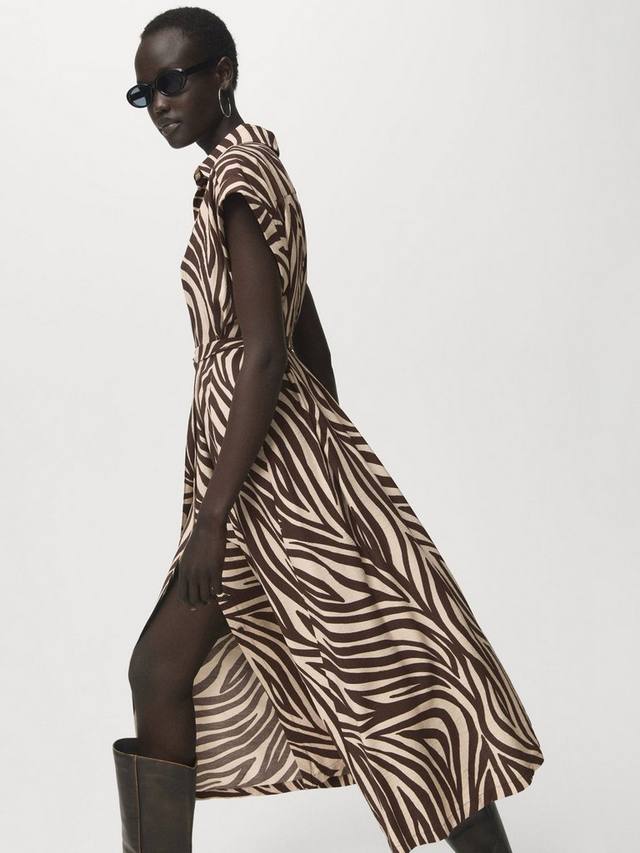Повседневное платье-рубашка миди. Узор зебра, без рукавов и воротник-стойка позволяют вам подчеркнуть свою индивидуальность, обеспечивая при этом комфорт. Выбирайте стиль, который идеально вписывается в образ и выделяется.