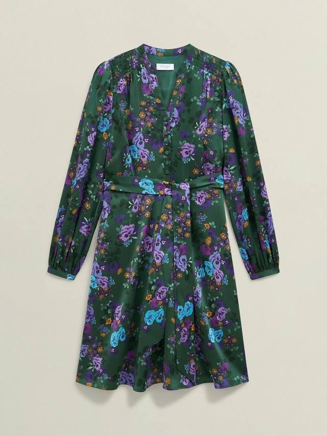 Потому что облегающий фасон и расклешенный крой всегда выглядят хорошо. Это мини-платье Hobbs с длинными рукавами, V-образным вырезом и цветочным принтом.