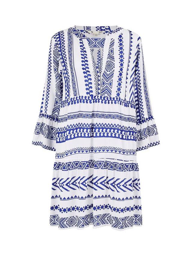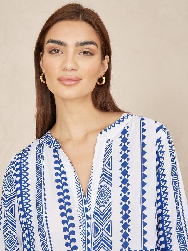 Идеально подходит для ношения поверх купальника у бассейна или на пляже этим летом. Лёгкая ткань обеспечивает удобную посадку в этой тунике, которая свободно струится по телу. Рукава 3/4 и вырез горловины дополнены полосатым геометрическим принтом, который словно воспевает лето.