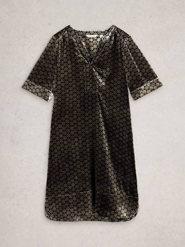 Сохраняйте непринужденный стиль. Это платье от White Stuff длиной до колена с рукавами до локтя имеет V-образный вырез и геометрический узор, который придаёт образу изящность.
