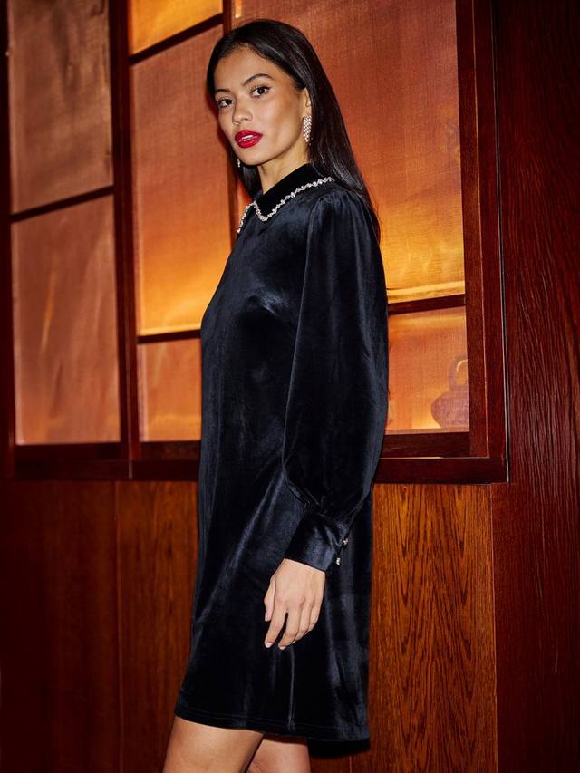 Если сомневаетесь, выбирайте прямой силуэт. Это мини-платье с длинными рукавами от Yumi имеет элегантный воротник, а отделка добавляет немного гламура.