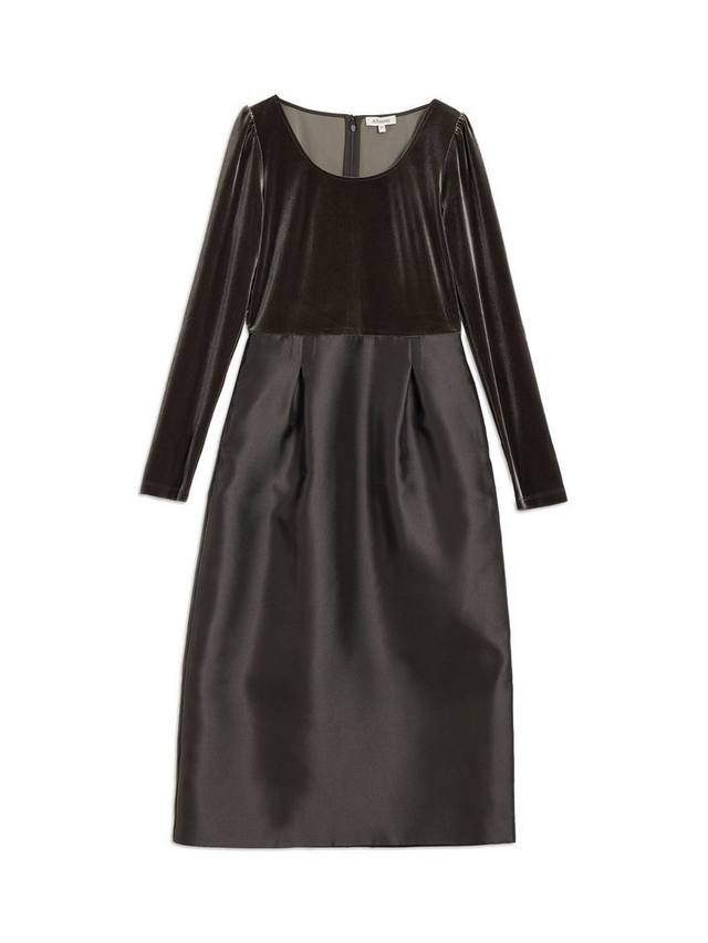 Украсьте свой гардероб этим изысканным платьем, сочетающим эластичный бархатный лиф с привлекательным круглым вырезом и пышную юбку из тафты в форме тюльпана для создания эффектного силуэта.