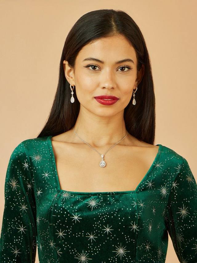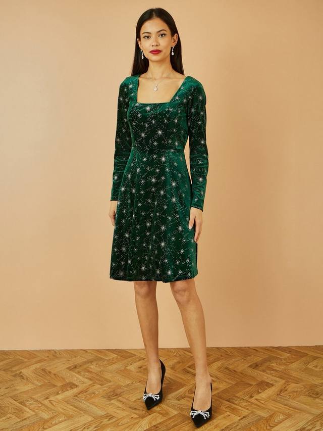 Платье, созданное для кружения. Это платье от Yumi длиной до колена с длинными рукавами, квадратным вырезом и принтом в виде звёзд.