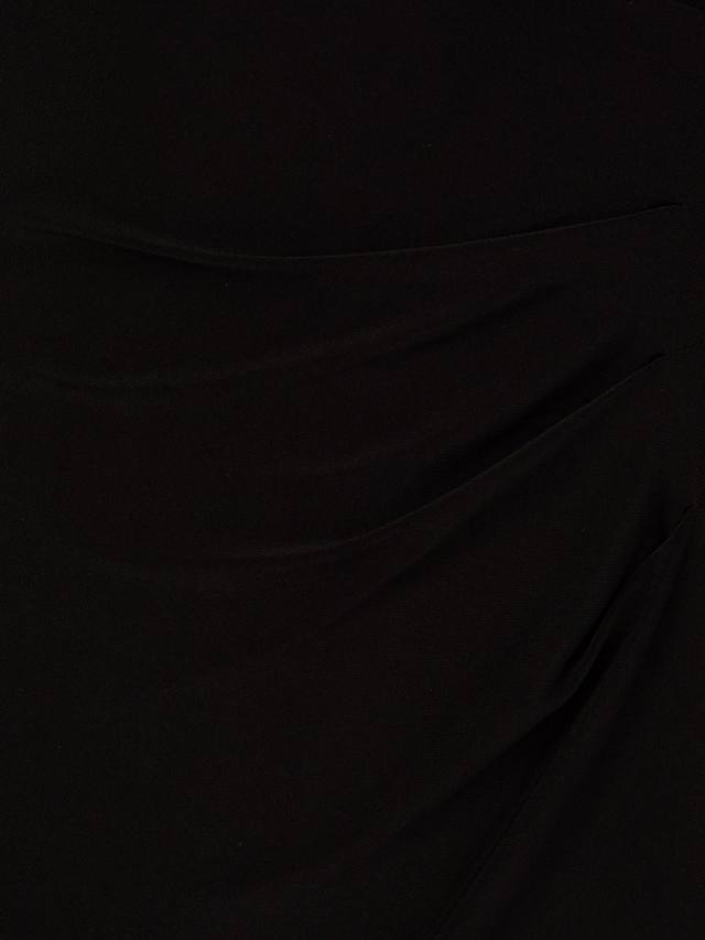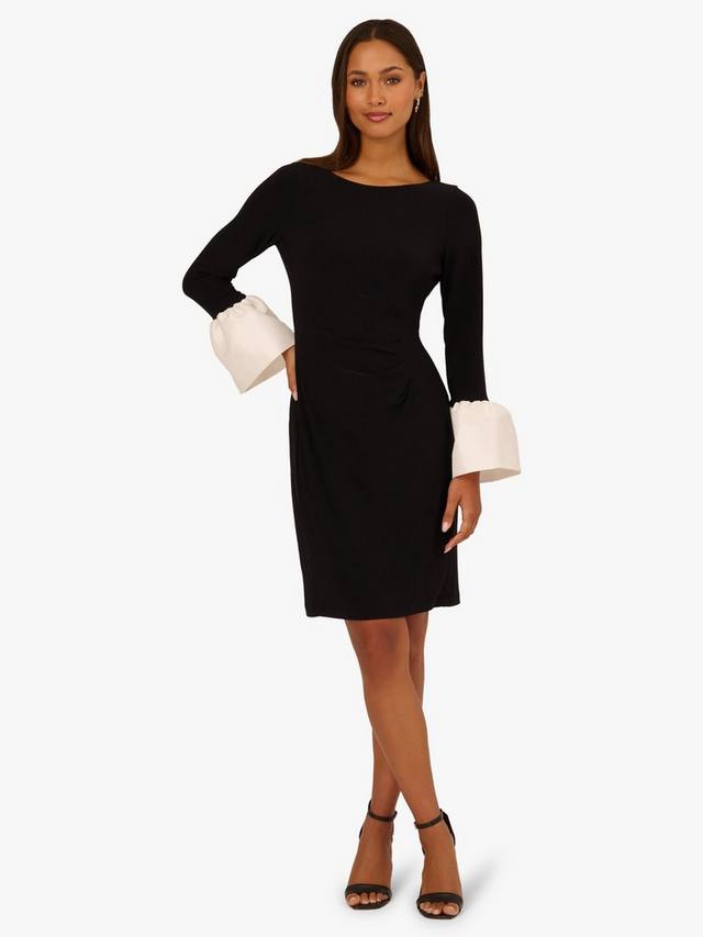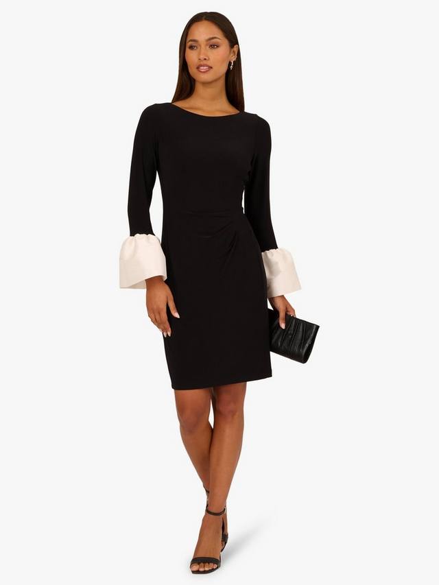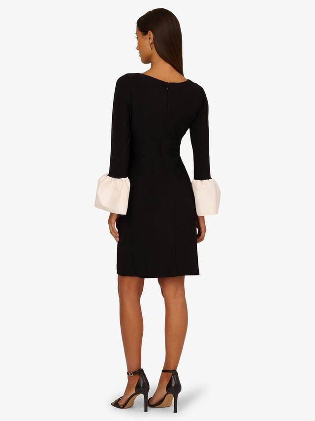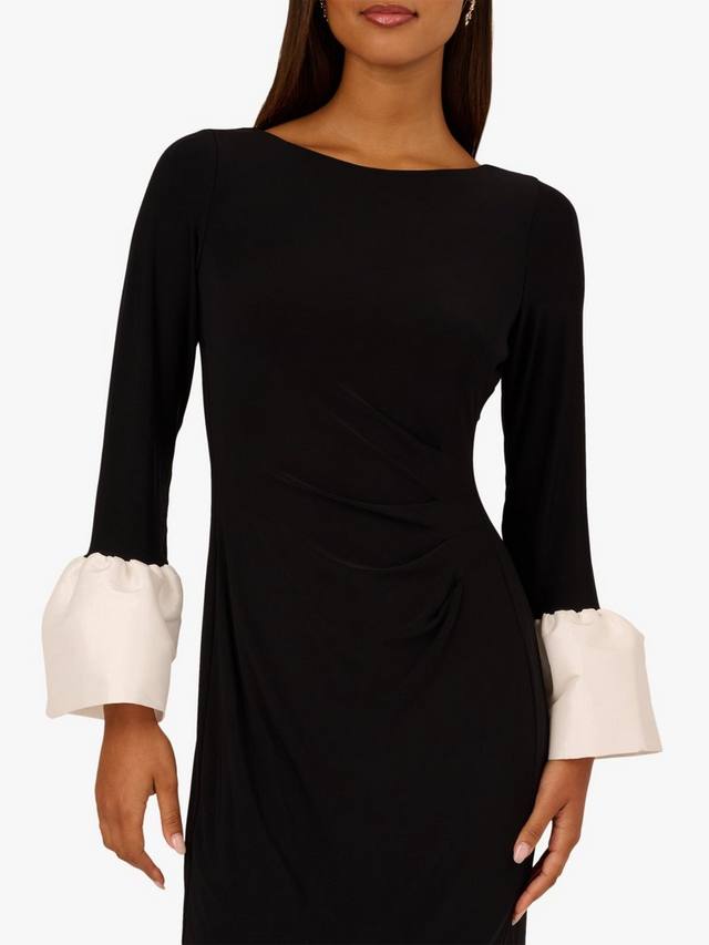 Это платье, воплощение современной элегантности, отличается элегантным силуэтом футляр до колена. Обтягивающая трикотажная ткань плавно драпируется, а изящные сборки по бокам добавляют нотку мягкости. Длинные рукава заканчиваются скульптурными манжетами из тафты, создавая эффектный контраст, идеально уравновешенный четкими линиями выреза лодочка. Изысканное и элегантное, это классическое платье идеально подойдет для коктейльных вечеринок, ужинов или особых торжеств.