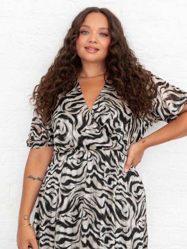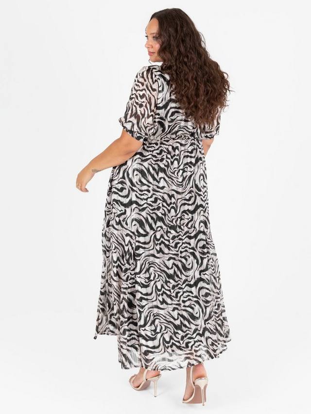 Это платье мидакси украшено анималистичным рисунком на дышащей двухцветной ткани с контрастной отделкой, короткими рукавами-буфами и V-образным вырезом с имитацией запаха. Свободный силуэт достигается за счет эластичной талии и юбки-годе.