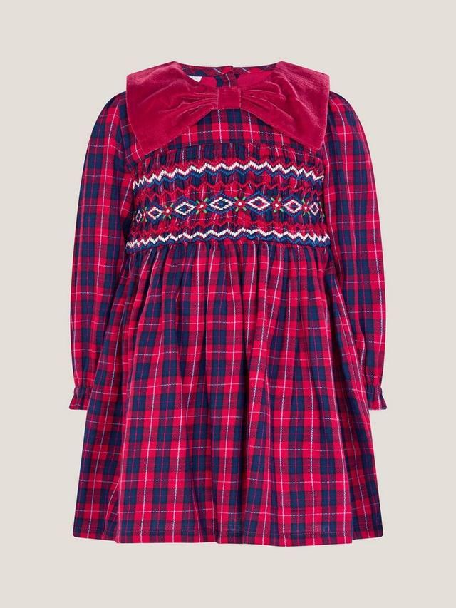 Это платье с рисунком в классическую клетку тартан на мягкой хлопковой ткани имеет свободный силуэт, обеспечивая малышу комфорт в течение всего дня. Платье украшено большим бархатным бантом на вырезе и декоративной вышивкой на талии. Застегивается на пуговицы сзади для удобства надевания.