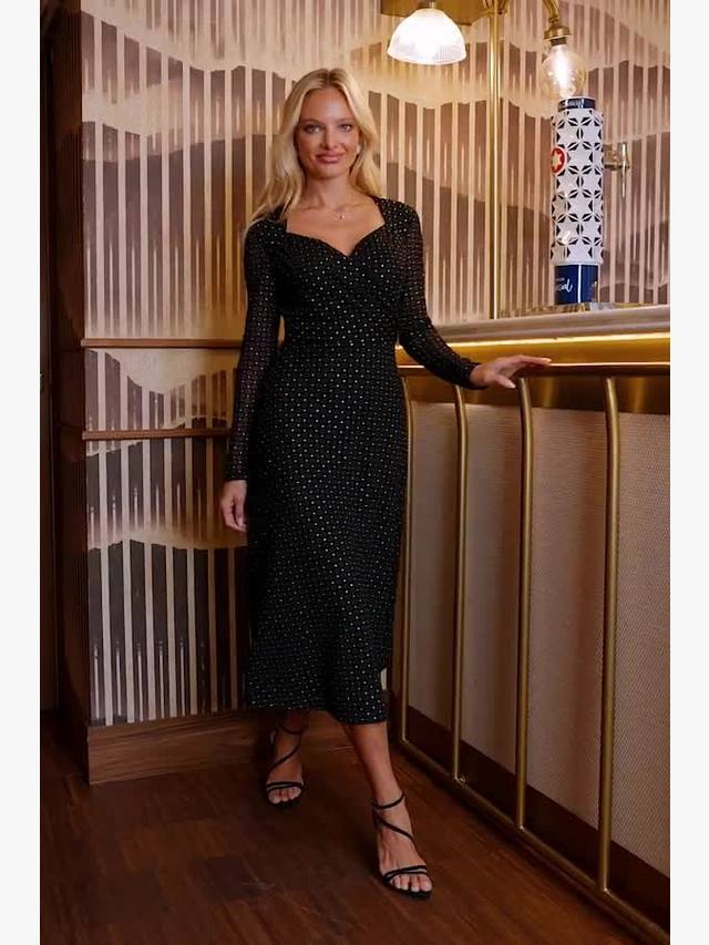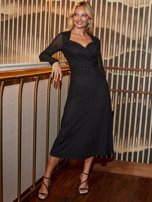 Сетчатое платье-халат миди от Sosandar. Металлическая отделка играет на свету, а удобный крой и длинные рукава позволяют вам уверенно выражать свой стиль весь вечер.