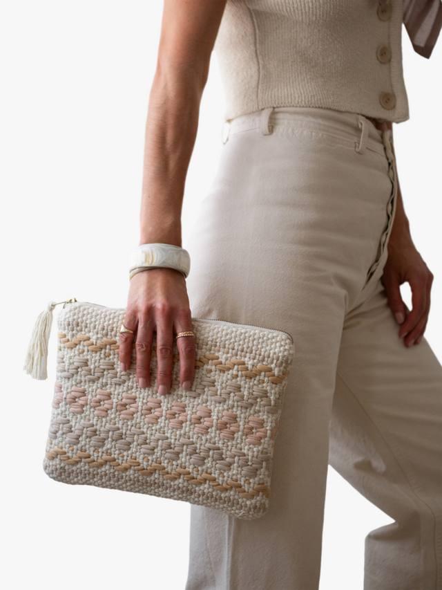 Эта вместительная сумочка-клатч, изготовленная из хлопка ручной работы с мягкой хлопковой подкладкой, практична и стильна. Текстурное плетение и нежная, землистая палитра делают её идеальной сумкой для неформальных случаев или для хранения ценных вещей в большой сумке-тоут. Застёгивается на приятную на ощупь молнию и украшена кисточкой.