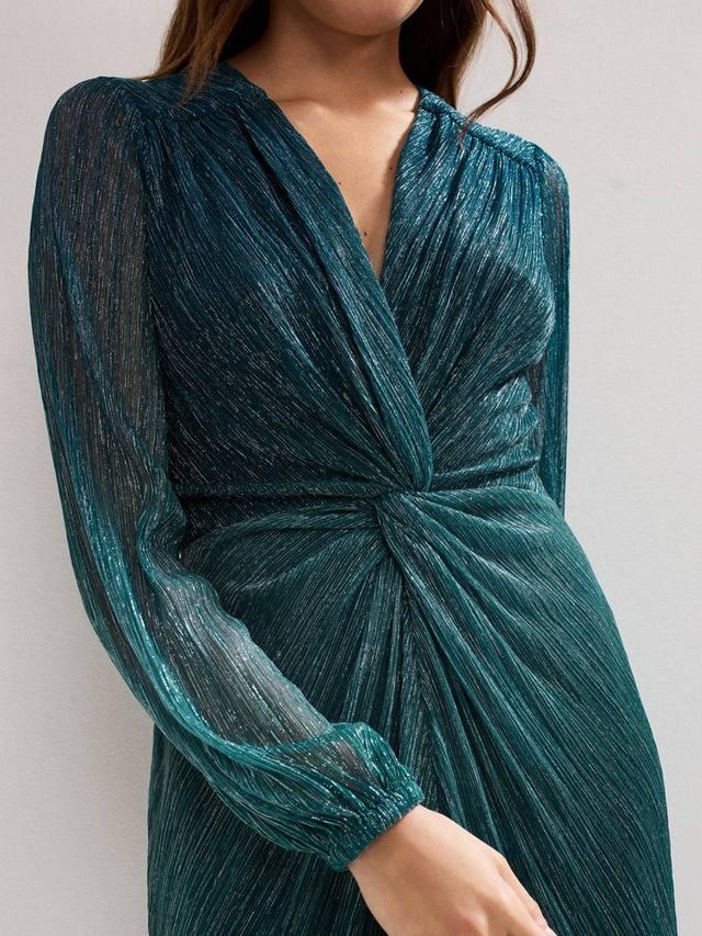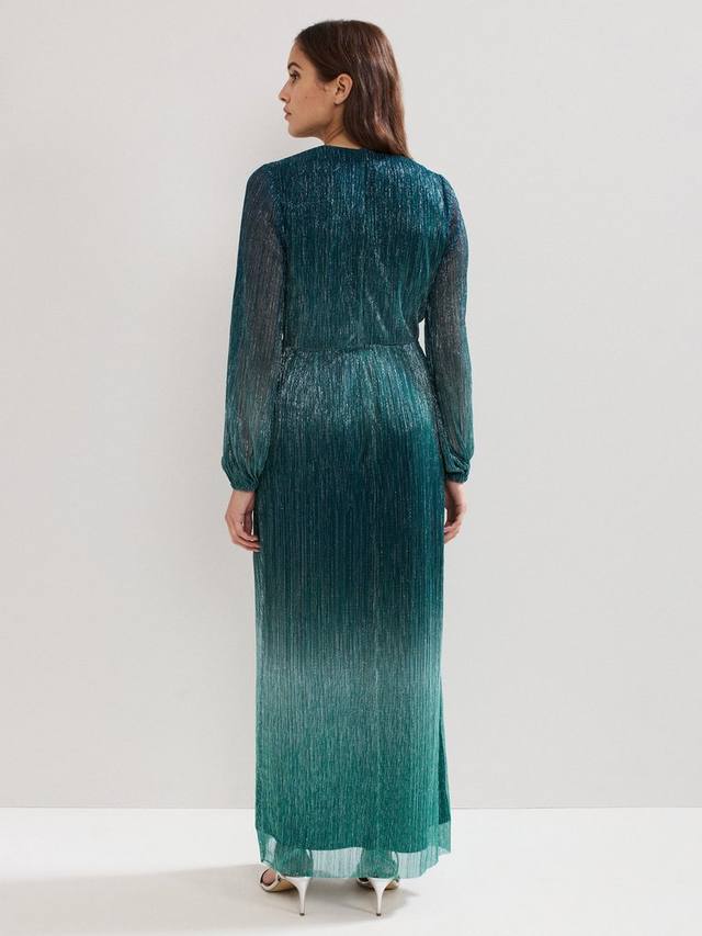Макси-фасон, который гарантированно привлечёт внимание. Это платье с современным омбре-дизайном украшено металлической нитью, которая красиво переливается на свету. Элегантный поворотный элемент идеально подходит для гламурных мероприятий.