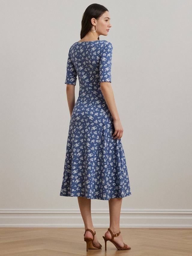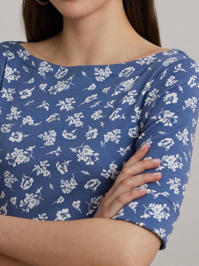 Платье миди из эластичного хлопка с цветочным принтом, освеженное очаровательным двухцветным цветочным мотивом, это платье миди с вырезом-лодочкой и рукавами до локтя выполнено из дышащего эластичного хлопка для удобной посадки и ощущения.