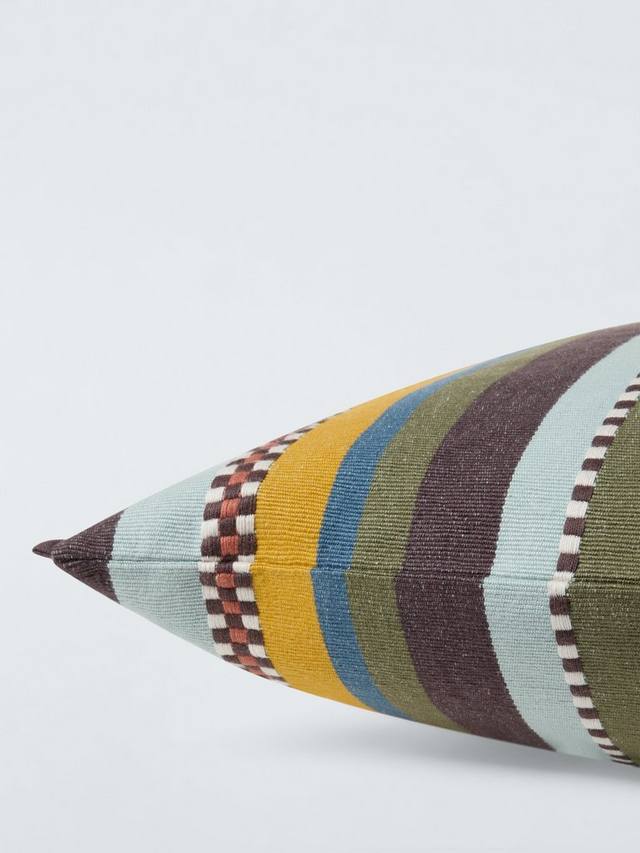 Эта плетеная полосатая подушка украшена вышивкой в клетку для дополнительной текстуры и цвета.