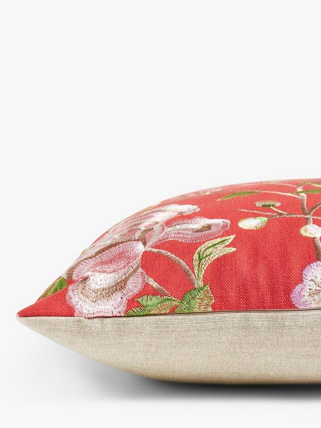 В этой интерпретации изящные волнистые попугайчики, вышитые из вискозы для создания нежного переливчатого эффекта, сидят на нежных ветках среди весенних цветов и аккуратных бутонов.