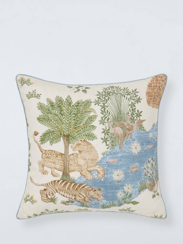 Фантастический принт в стиле 1970-х годов из архива Sanderson, Pamir Garden, представляет собой персидский сад и оазис с цветочными источниками, стилизованными деревьями, тиграми и антилопами.