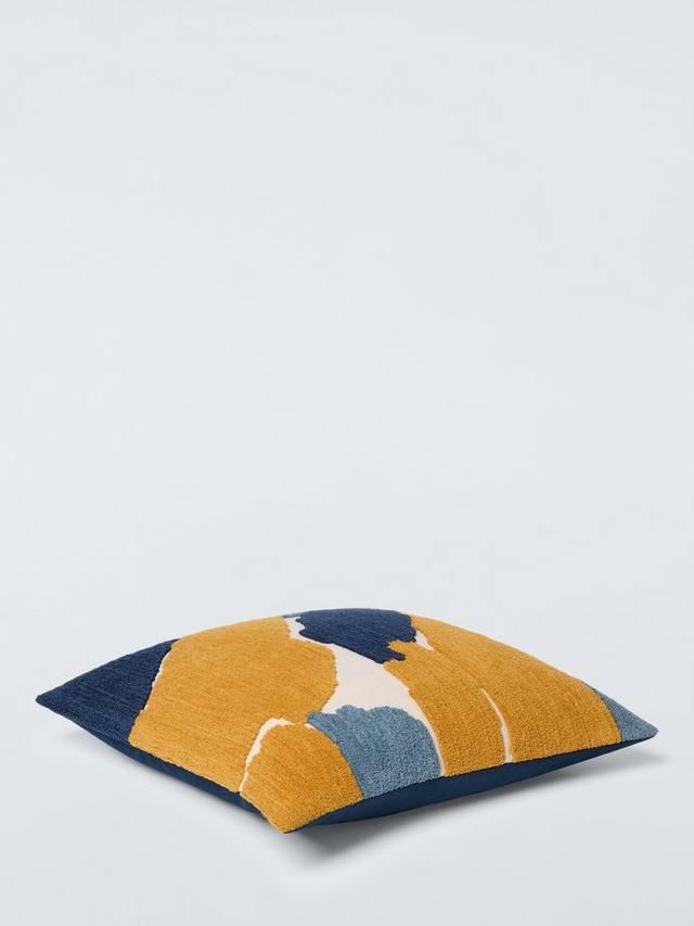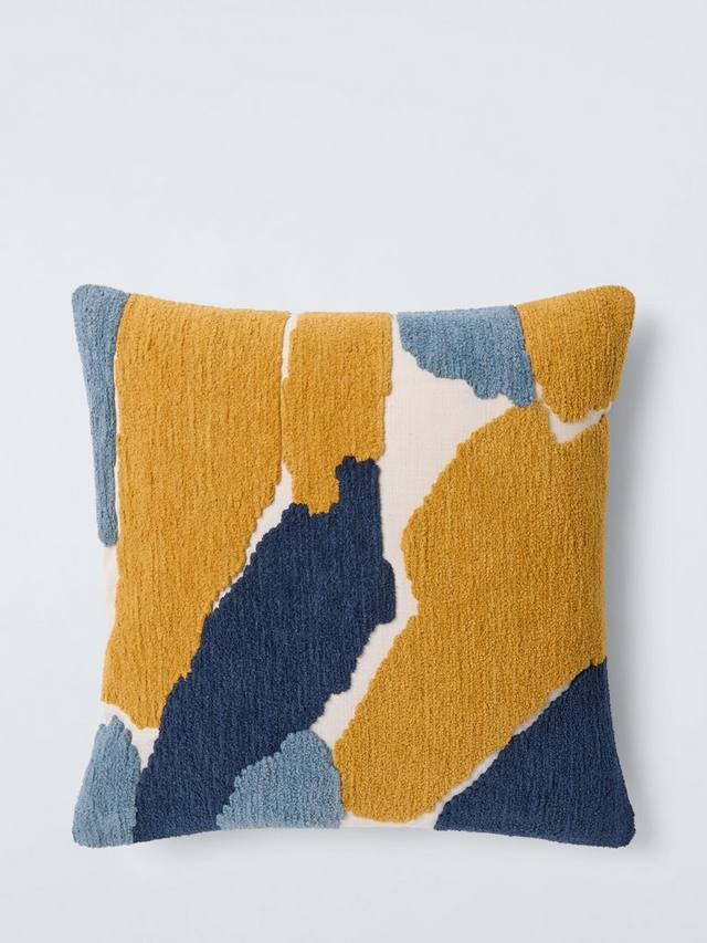 Эта чудесная тактильная подушка украшена абстрактными блоками шенилла ярких цветов на естественном фоне. Обратная сторона однотонного синего цвета.