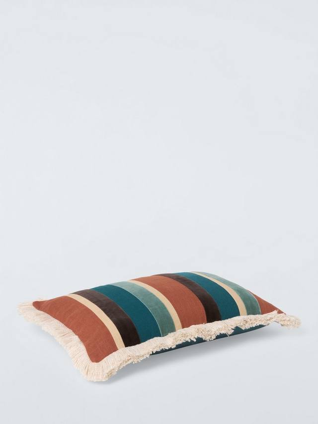 Тканые полосы, изнаночная сторона бирюзового цвета и мягкая бахрома придают этой красочной подушке отчетливый ретро-образ.