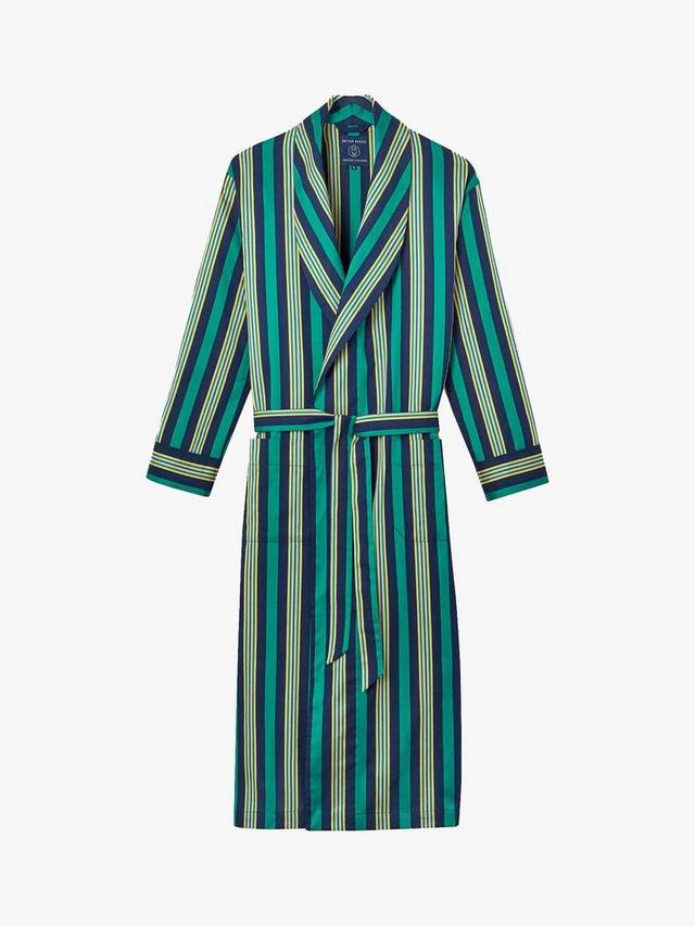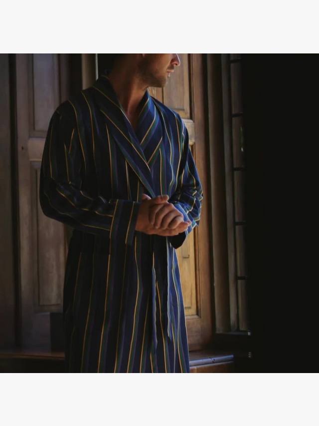 Этот классический халат, созданный в стиле традиционных полковых галстуков, отсылает к британскому наследию: внутренние завязки, шалевый воротник и накладные карманы завязываются на классический пояс для удобства.