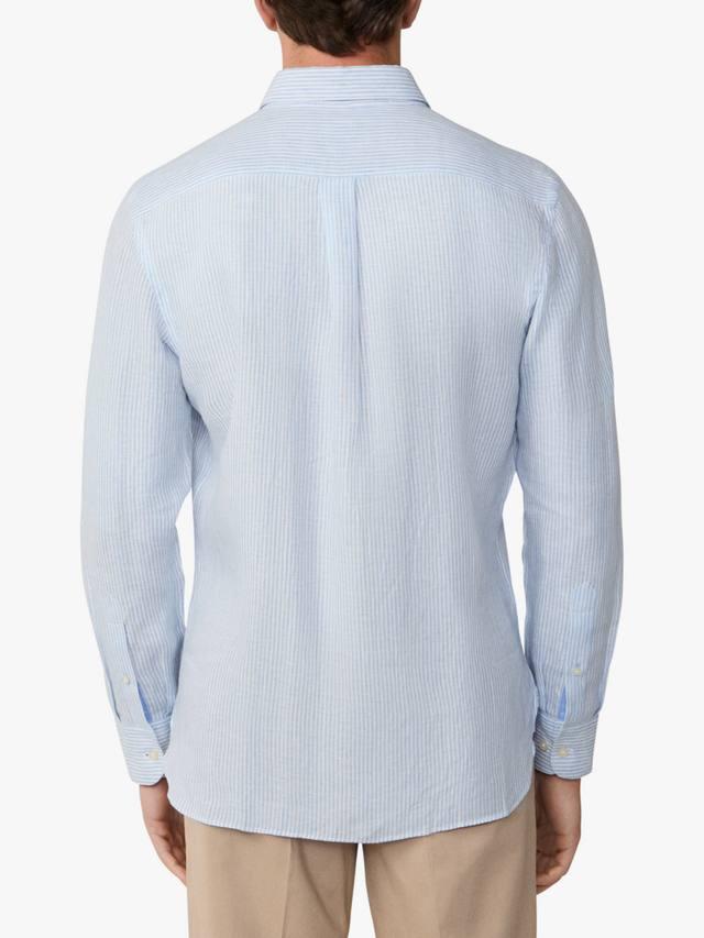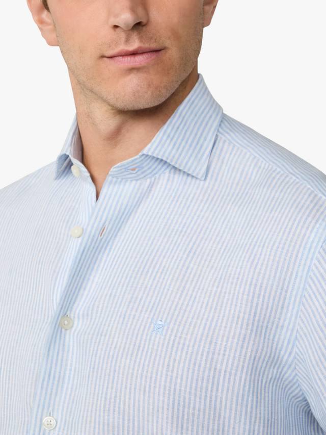 Эту универсальную рубашку Hackett London объединяет отложной воротник Kent, контрастные полосы и лёгкий лён. Вышивка в виде котелка и зонтика в тон на груди создаёт фирменный акцент.