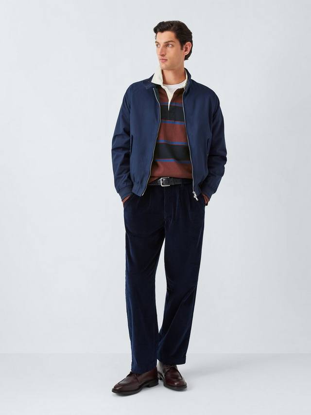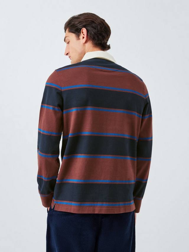В этом хлопковом изделии все дело в контрасте, будь то воротник, планка или различные горизонтальные полосы.