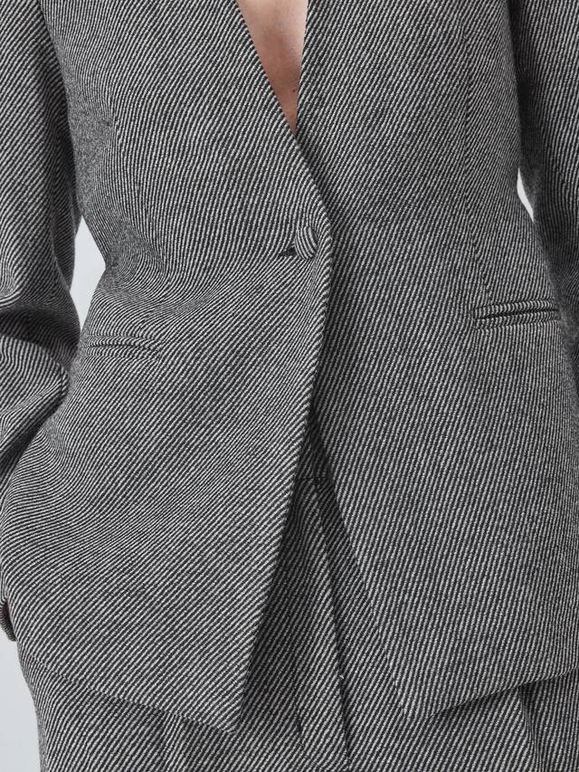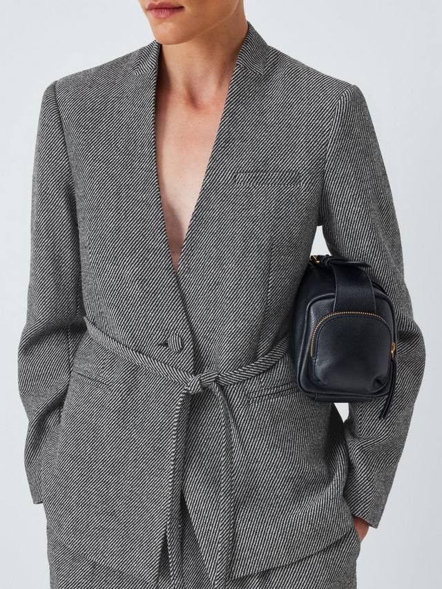 Однобортный пиджак в полоску, вдохновлённый традициями моды. Изделие изготовлено из мягкой и тёплой шерстяной саржи. Имеет прорезные карманы, тканевую пуговицу и пояс на завязке. Сочетайте с широкими брюками того же кроя для создания полного шика.