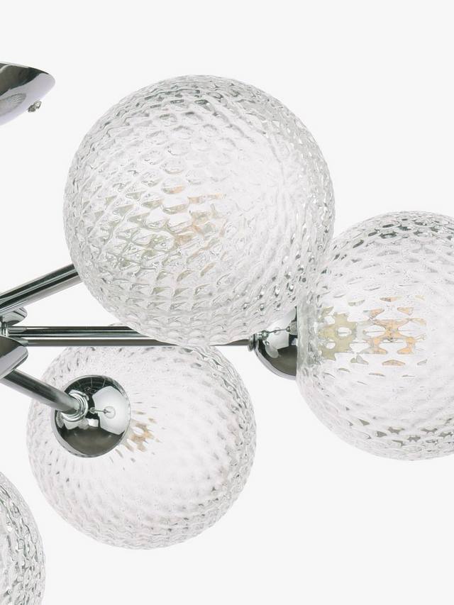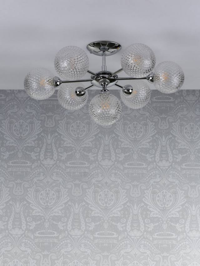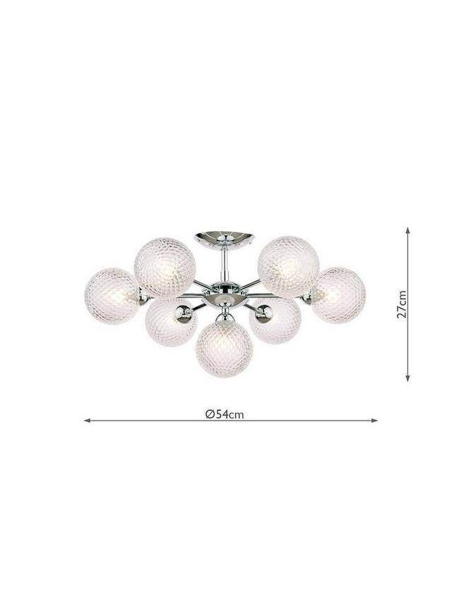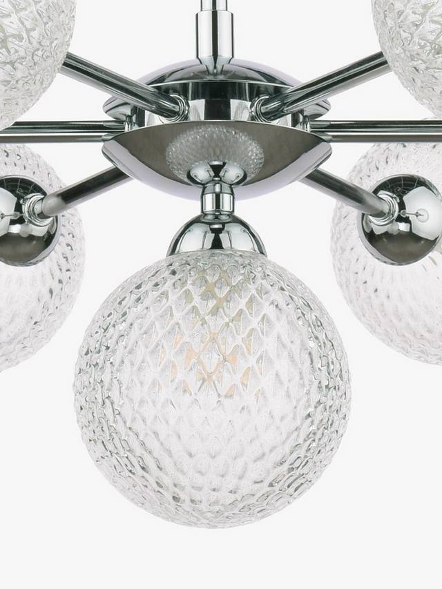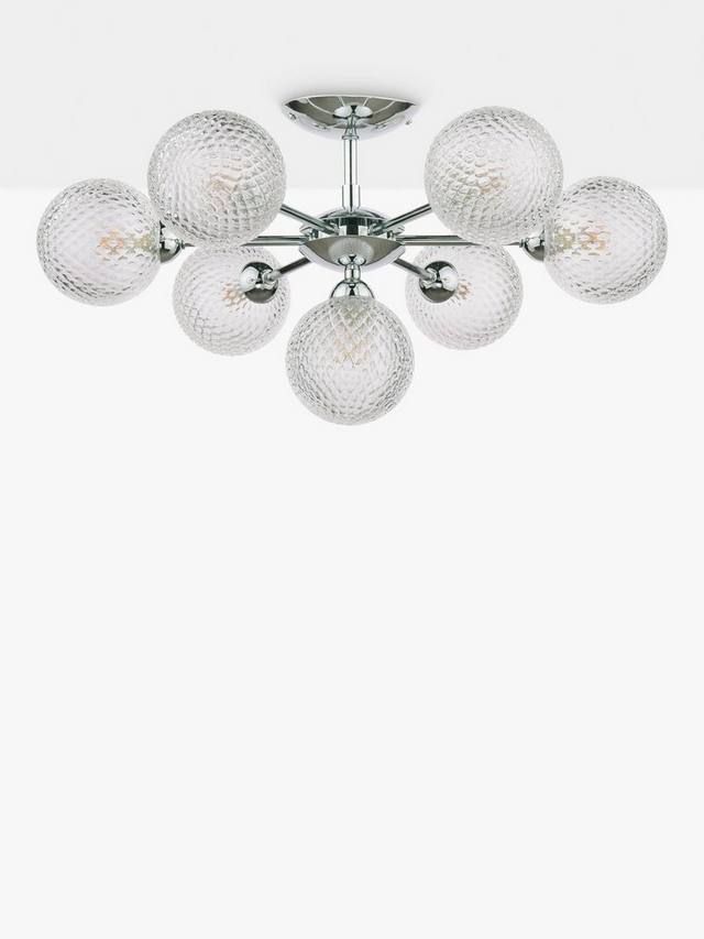 Благодаря семи светильникам этот эффектный полуутопленный потолочный светильник наполнит комнату светом. Он оснащен фактурными стеклянными плафонами, которые создают мерцающий акцент при освещении. Светильник доступен в различных вариантах металлической отделки. Требуется семь светодиодных лампочек.