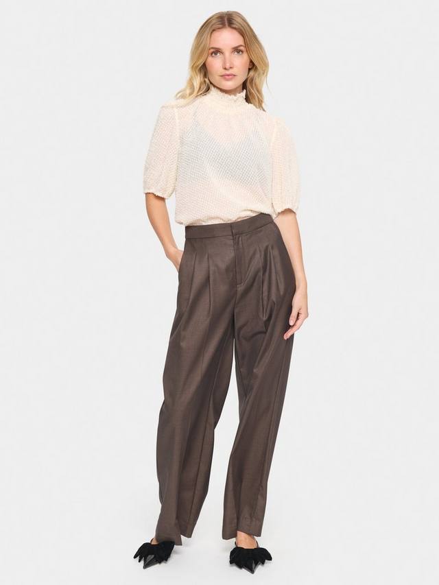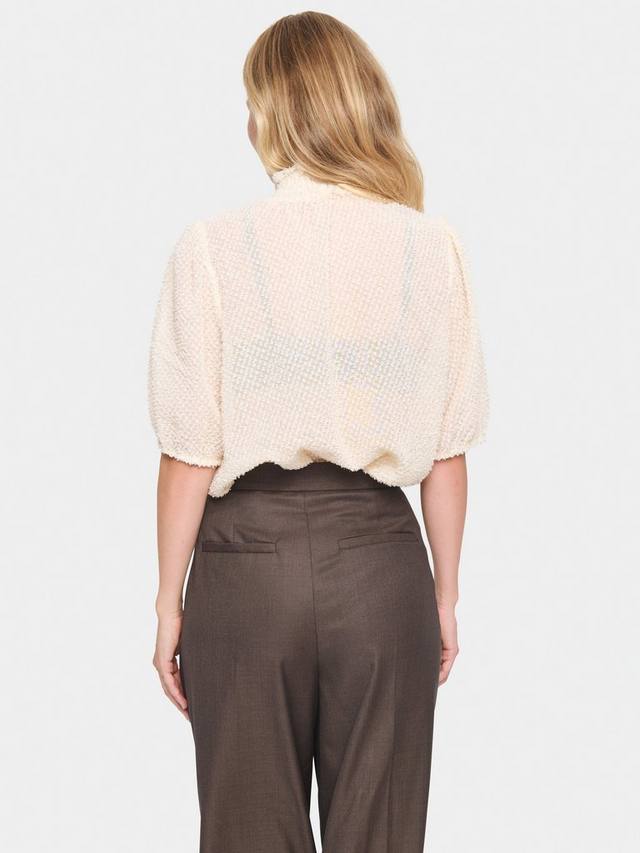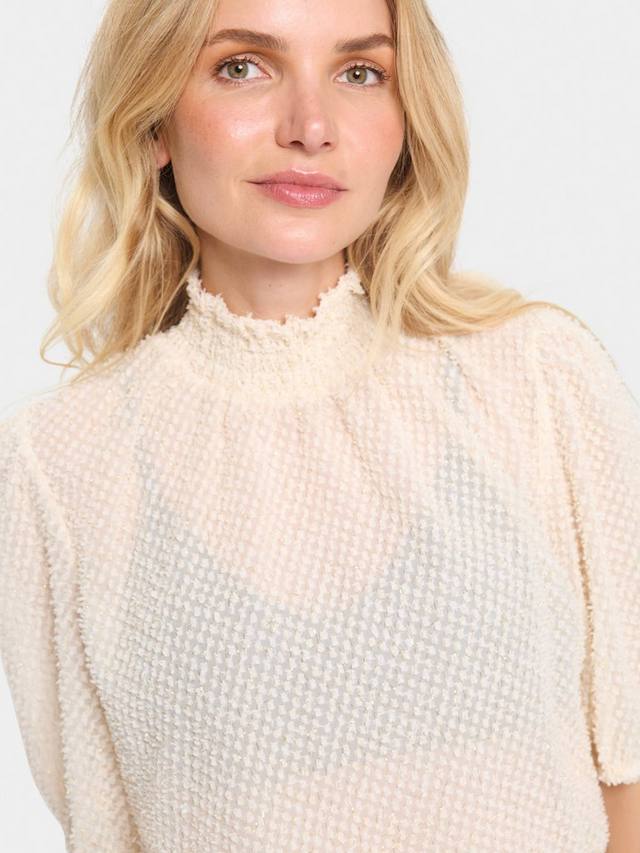 Эта блузка из Сен-Тропе станет прекрасным дополнением к вашему гардеробу и дополнена изящной кружевной отделкой. Высокий вырез горловины и рукава-буфы до середины бедра выполнены из ворсистой прозрачной ткани.