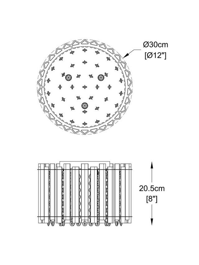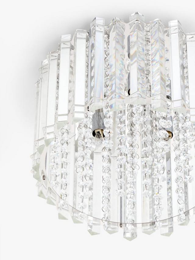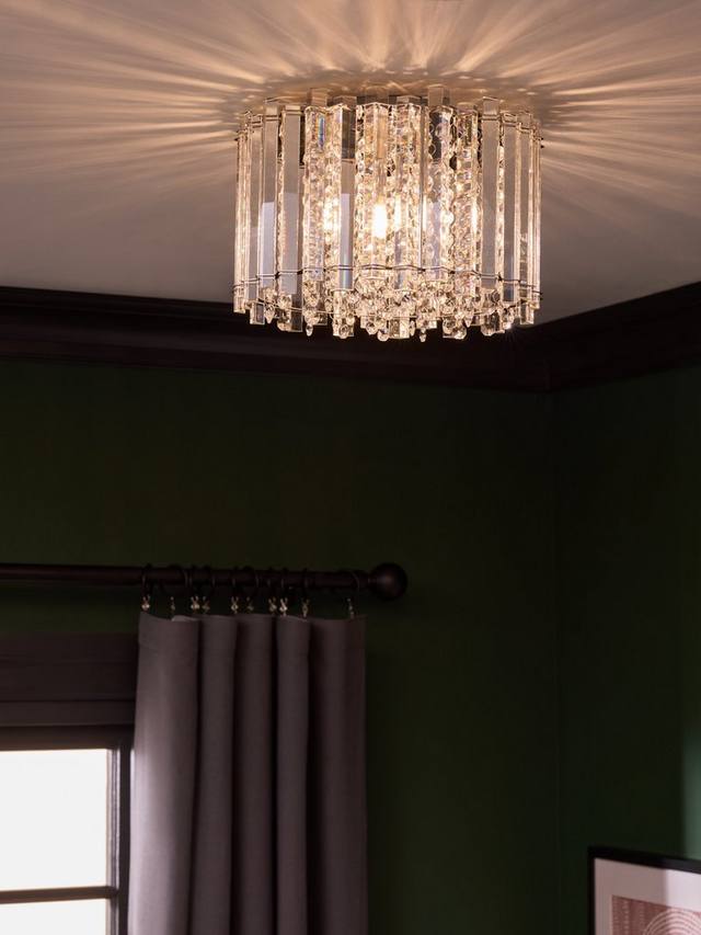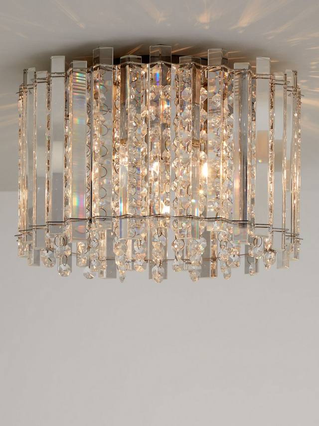 Этот гранёный, полузакрытый потолочный светильник, создающий ослепительный акцент в любой комнате, создан с использованием вертикально расположенных зеркальных полос и кристаллов. Свет исходит из центра и отражается от кристаллов, создавая мерцающий поток света. Его привлекающий внимание дизайн подходит для размещения вплотную к потолку и дополнит изысканный интерьер.