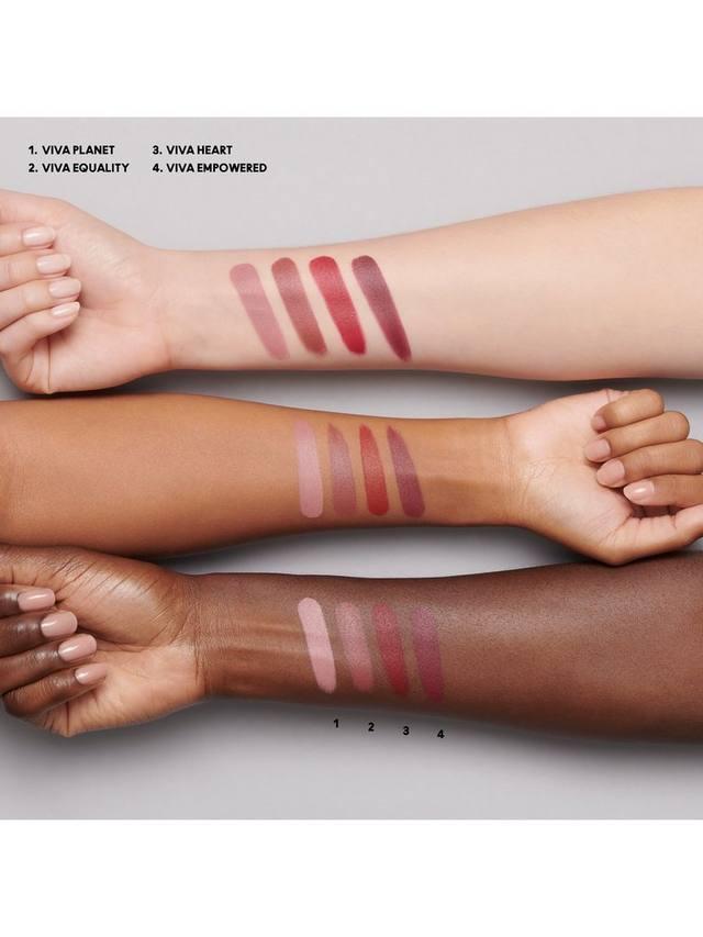 Насыщенный коричневато-сине-красный оттенок Viva Glam I теперь называется Viva Heart. Приглушенный розовато-бежевый лиловый оттенок Viva Glam II теперь называется Viva Planet. Приглушенный коричневато-сливовый оттенок Viva Glam III теперь называется Viva Empowered. Насыщенный нейтральный оттенок Viva Equality — это совершенно новая новинка!