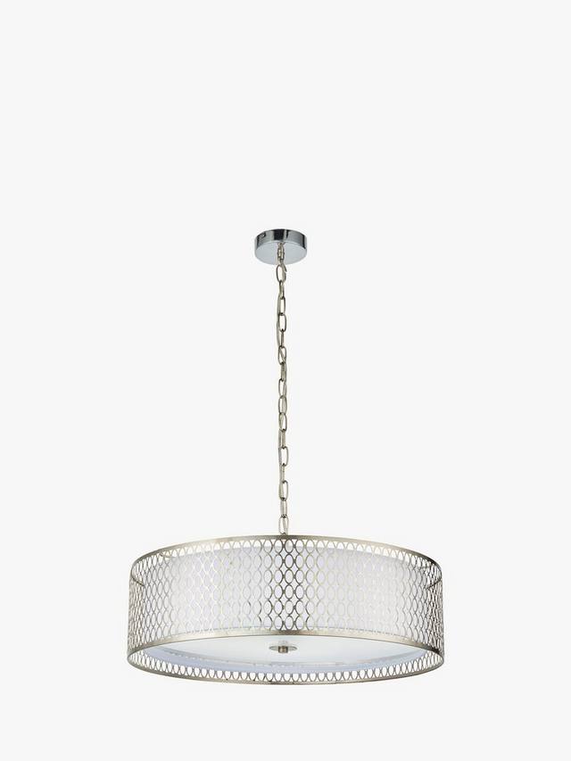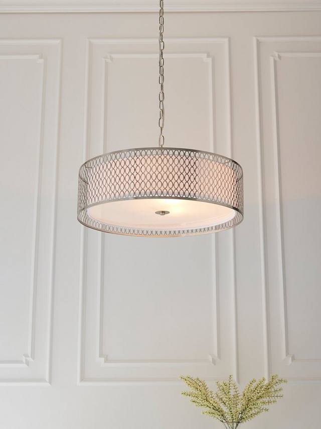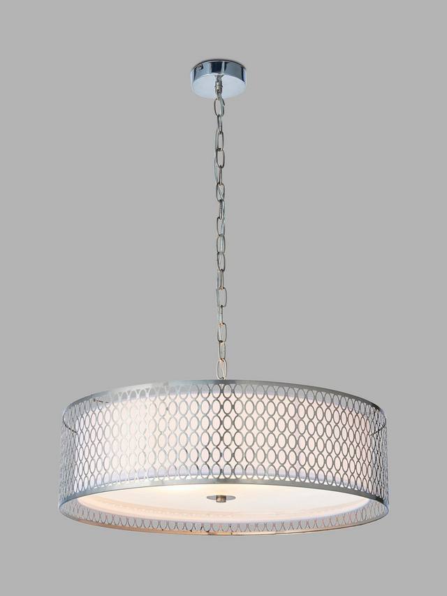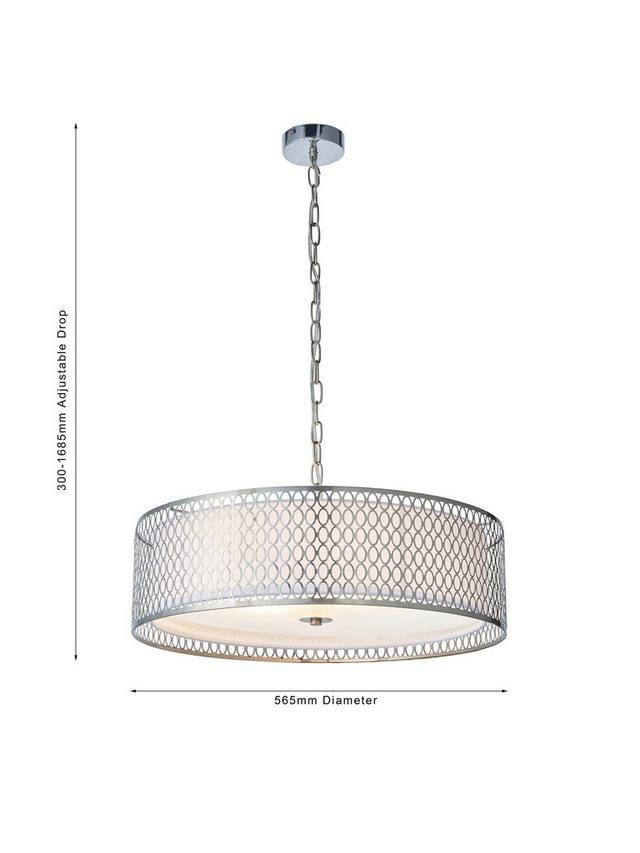 Этот подвесной светильник с геометрическим ажурным металлическим абажуром, установленным вокруг внутреннего тканевого абажура, создает рассеянный поток света. Он подвешен на регулируемой по высоте цепи.