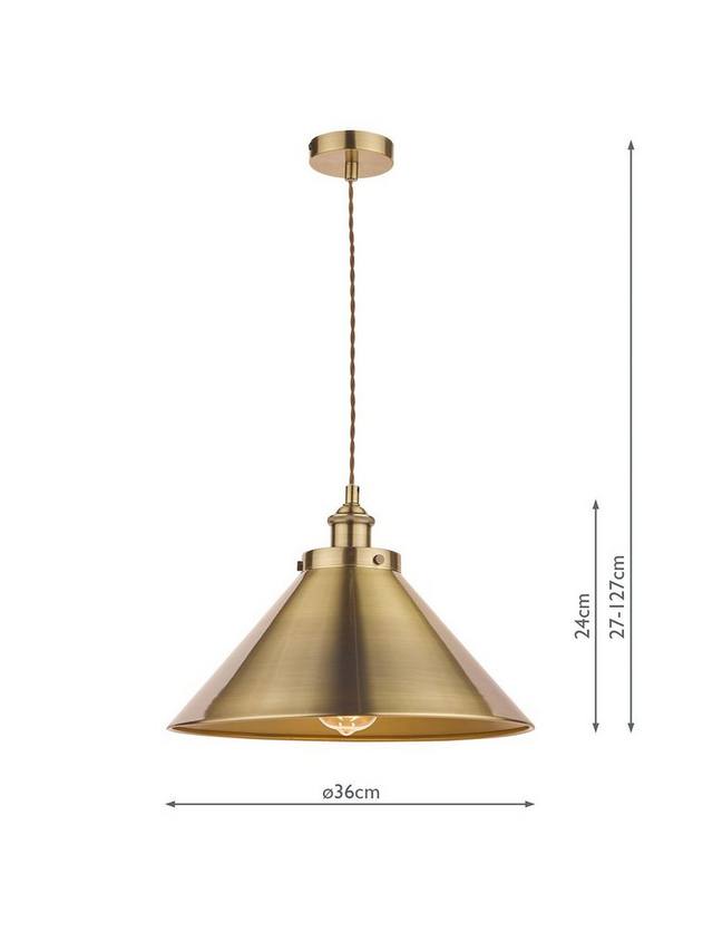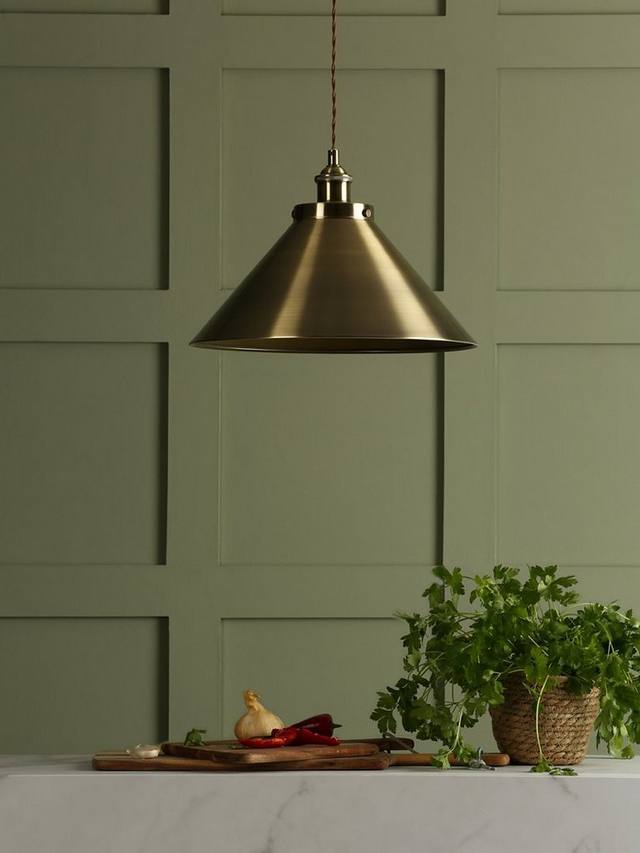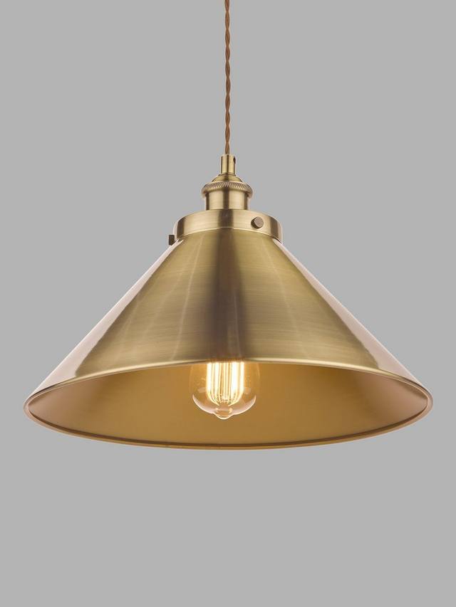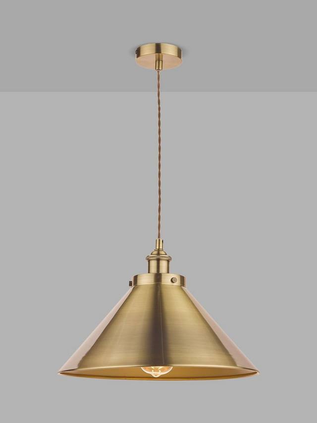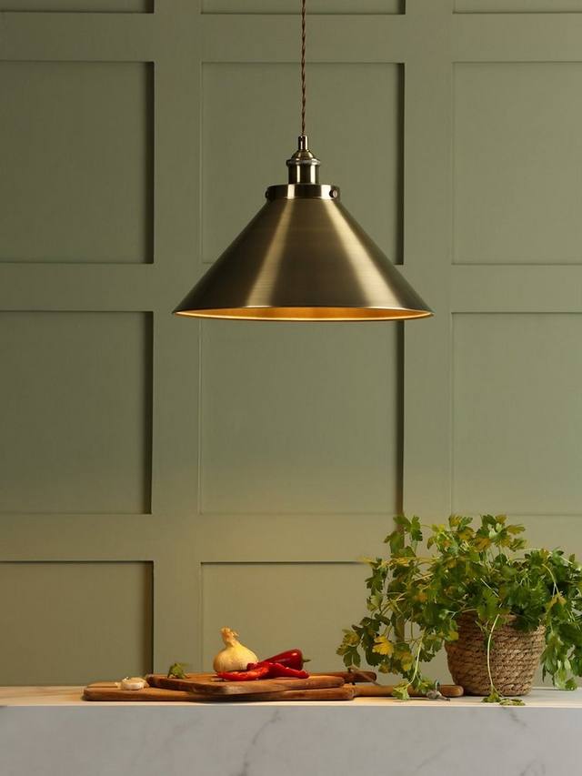 Потолочный светильник Rufus Grande от Laura Ashley с превосходной отделкой под старинную латунь будет великолепно смотреться на кухне или в столовой, над столом или даже в домашнем офисе. Rufus — это большой, качественный подвесной светильник с большим конусообразным абажуром из гнутого металла с аккуратным закругленным краем. Сплошной абажур направляет свет вниз, на поверхность, не только создавая великолепное освещение, но и улучшая атмосферу при приглушенном освещении. В сочетании с витым светло-коричневым плетеным шнуром из ткани он создаёт винтажный образ. Высоту светильника можно регулировать после установки, поэтому этот потолочный светильник также подходит для помещений с высокими потолками. Лампочка не входит в комплект.