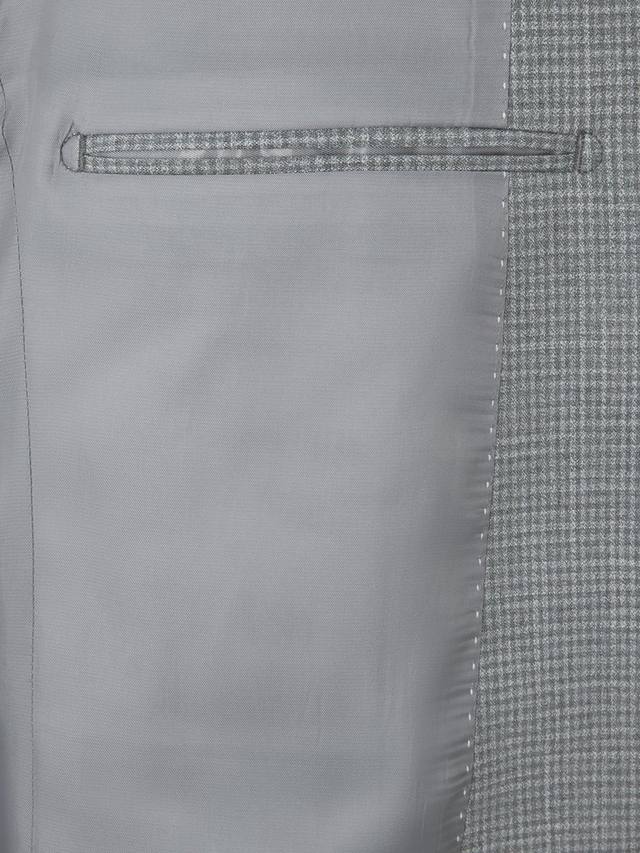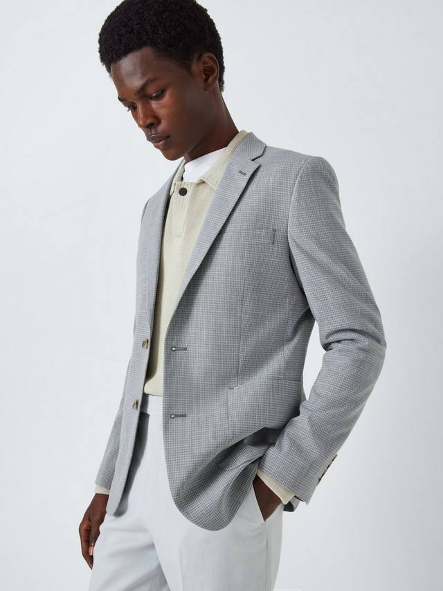 Однобортный пиджак облегающего кроя. Изготовлен из светло-серой ткани в мелкую клетку и идеально подходит для создания лёгкого слоя одежды в летние месяцы.