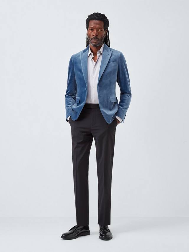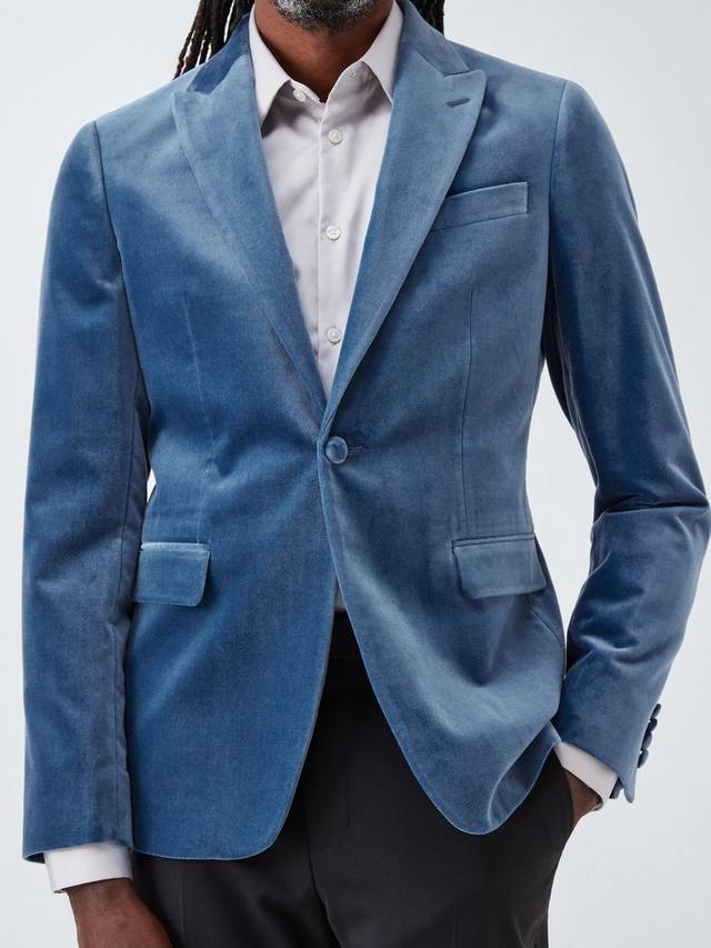 Этот бархатный блейзер с заостренными лацканами, карманами с клапанами на бедрах и одним прорезным карманом на груди. Он также застегивается на бархатные пуговицы и имеет одну шлицу сзади.