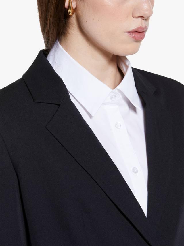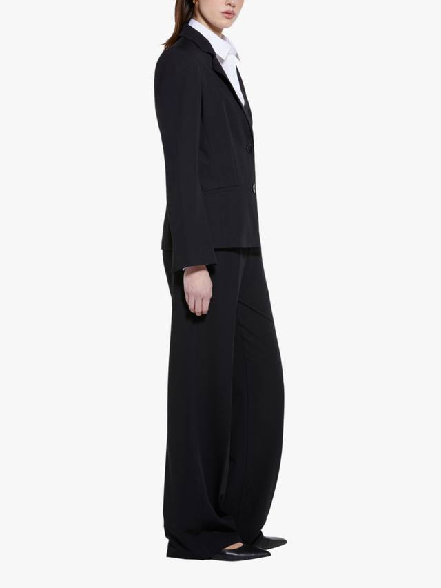 Габардиновый блейзер из смесовой вискозы с эластичными вставками, с вырезами и плиссировкой. Низкие лацканы, однобортный пиджак с застежкой на две пуговицы, длинные рукава с разрезами на манжетах и два прорезных кармана спереди, спрятанных по бокам.