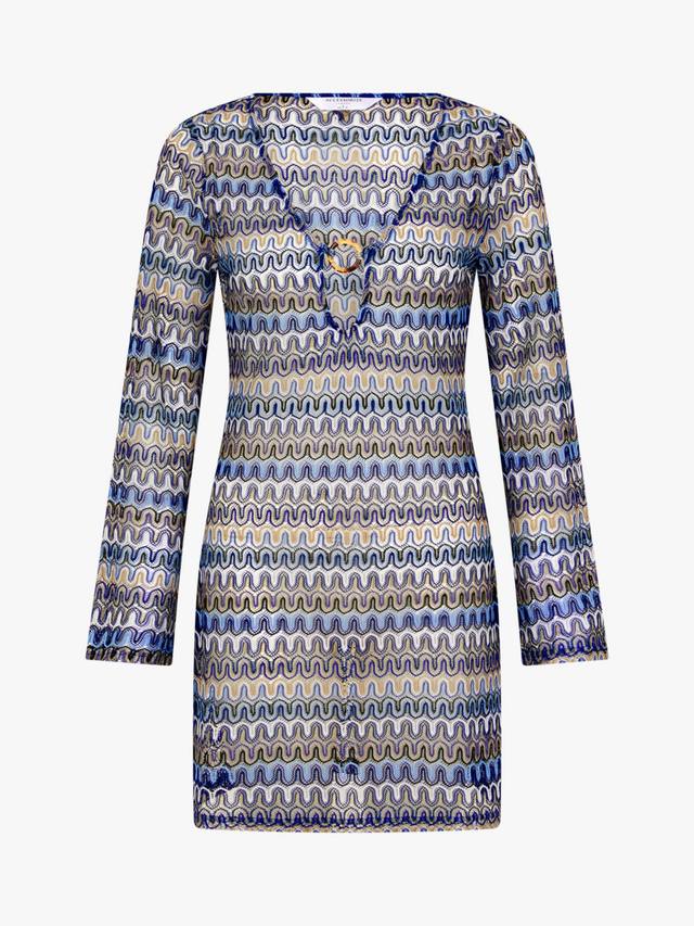 Ибица зовёт, пора тусоваться! Идеальный выбор для вечеринок у бассейна и коктейлей на пляже. Эта накидка скроена как мини-платье с длинными рукавами, зигзагообразным узором и прозрачной отделкой.