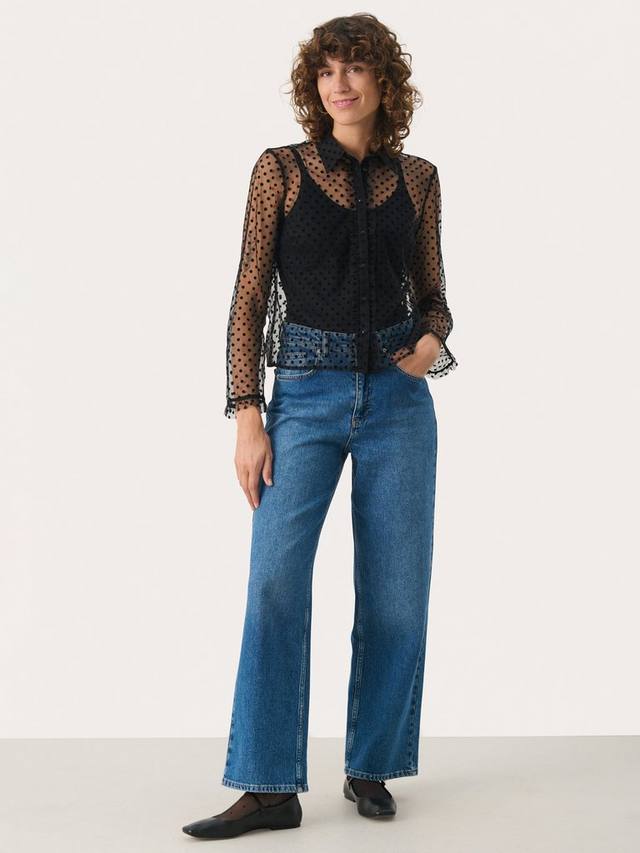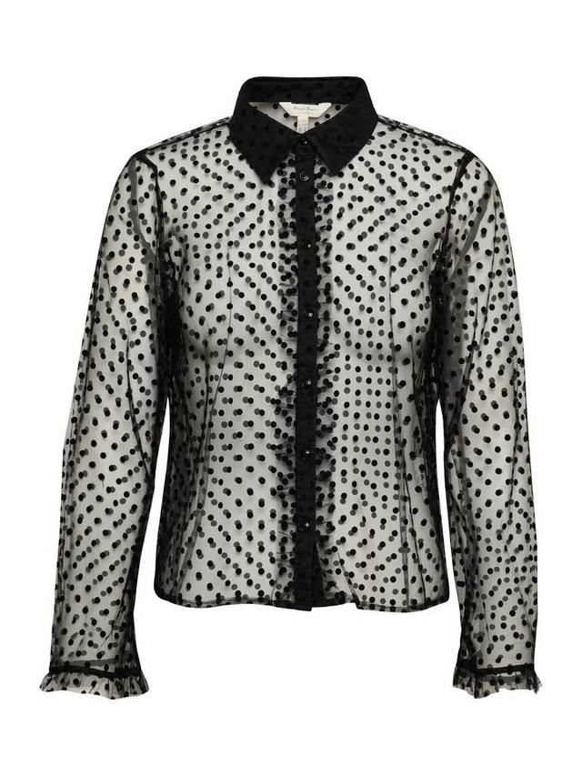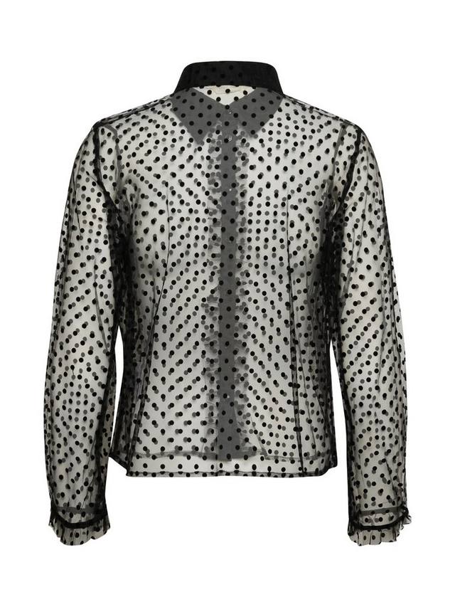 Рубашка Marikke — стильная и стильная шифоновая рубашка, которая сделает любой образ шикарным. Она имеет отложной воротник и застежку на пуговицы, а также прозрачную ткань в горошек. Длинные рукава с эластичными краями и оборками, а сама рубашка имеет отрез по бедрам.