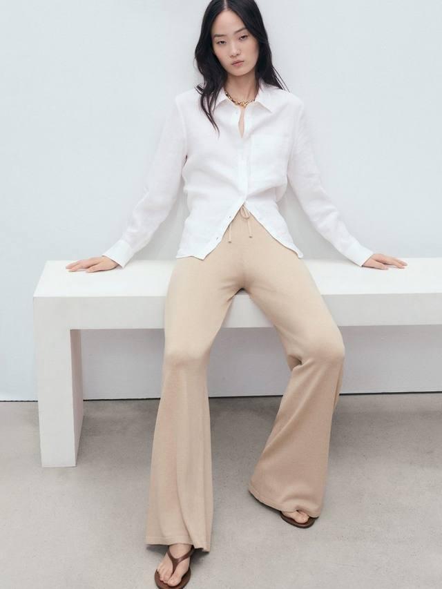 Пара прямых брюк от Mango, которые естественно сидят на бедрах и связаны тонкой вязкой из воздушной льняной смеси.