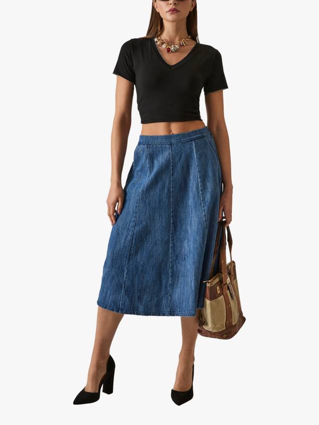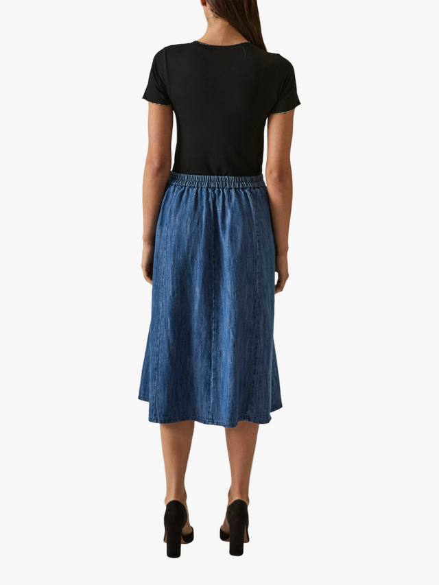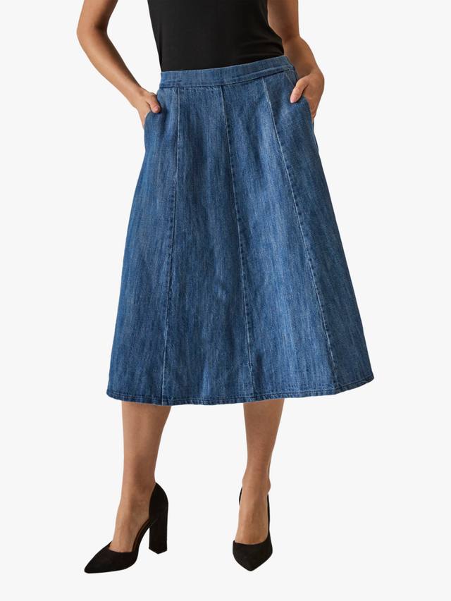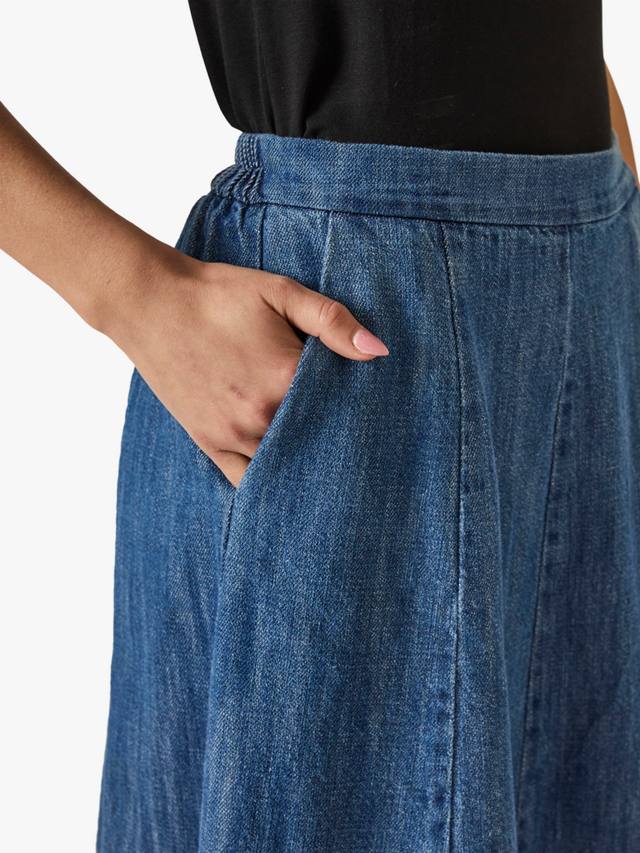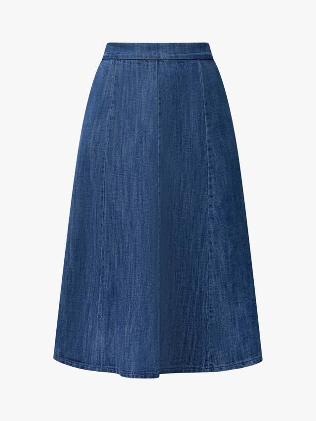 Эта джинсовая юбка без застежек длиной ниже колена дополнена регулируемым поясом сзади для идеальной посадки и комфорта в течение всего дня. Расклешенный силуэт выгодно подчеркивает фигуру, а незаметные вертикальные швы и удобные боковые карманы добавляют структурности и практичности. Эта универсальная и шикарная юбка станет незаменимой вещью в вашем повседневном гардеробе.