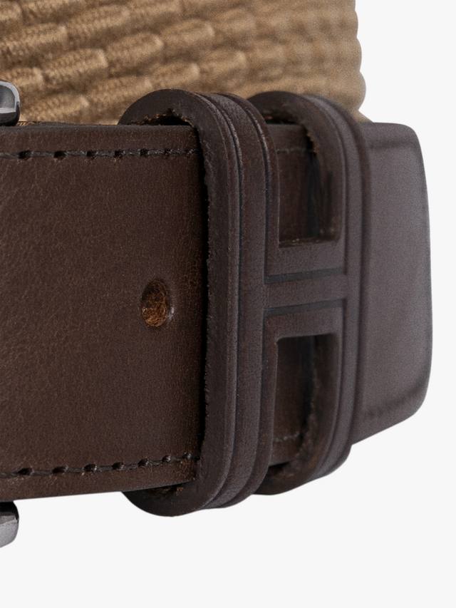Этот ремень в стиле casual, сплетённый из лёгкой ткани, с металлической пряжкой, кожаными наконечниками, декоративной строчкой и парашютным шнуром из Испании, дополнен кожаной петлёй в форме монограммы H. Сделано в Англии.