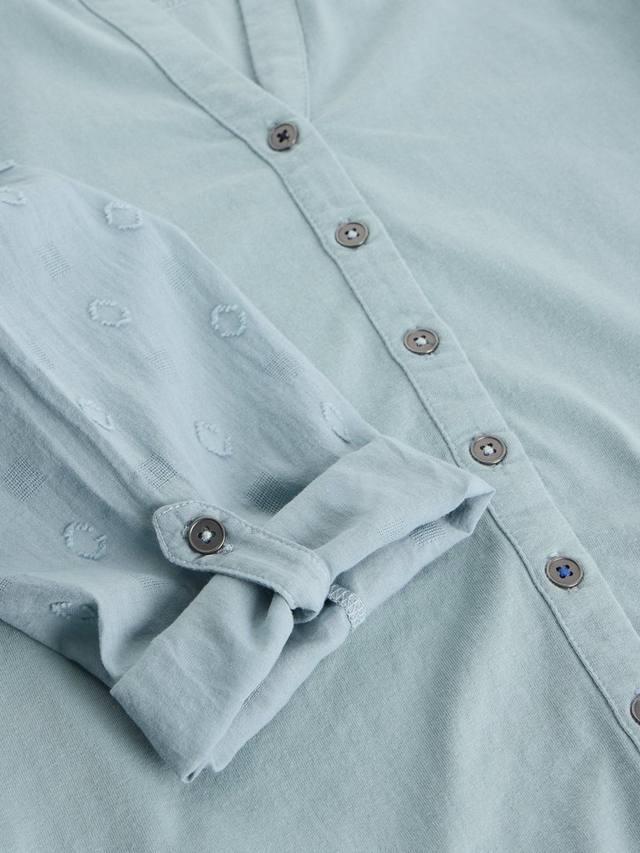 Классическая рубашка с длинным рукавом, застегивающаяся на пуговицы, с тканными рукавами и тканной вставкой на плечах.