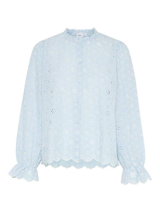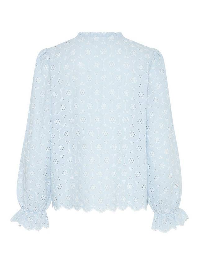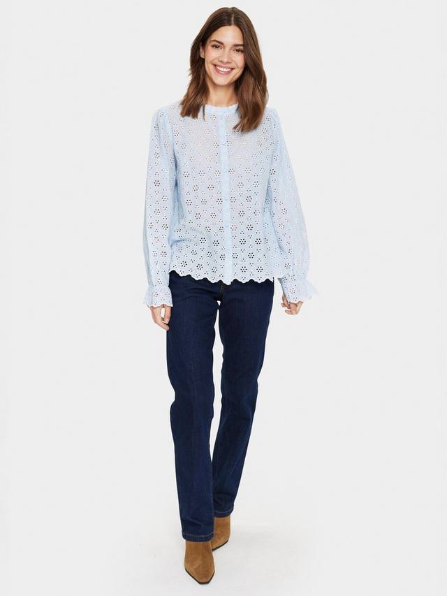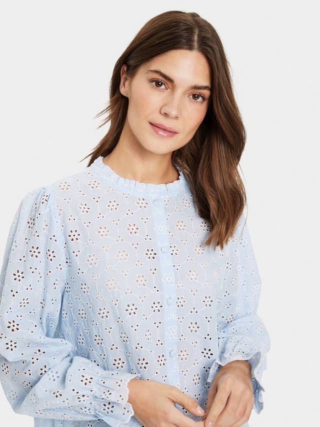 Рубашка Iveta — симпатичный фасон из красивой ткани с шитьем англез. Высокий ворот с оборкой и застежка на пуговицы. Длинные свободные рукава с оборкой, классический крой и фестончатые края.