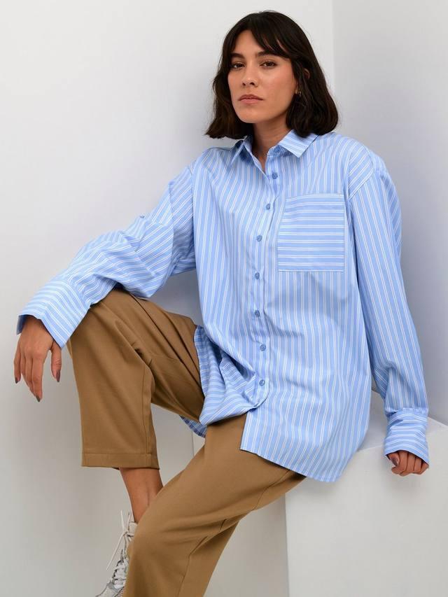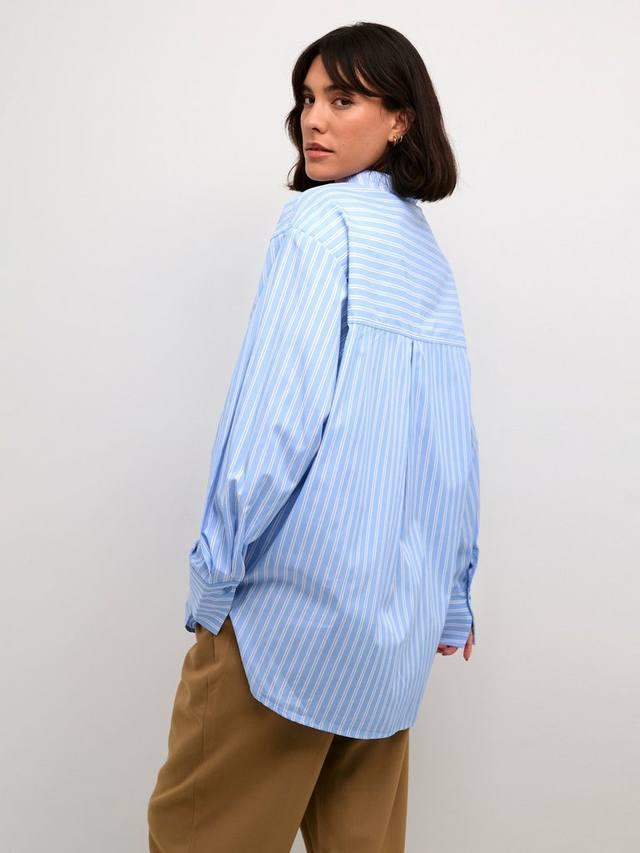 Рубашка Mackie — это повседневный и стильный фасон. Она имеет отложной воротник и пуговицы, свободный крой со спущенными плечами. Рукава свободные, отрезные ниже костяшек, с широкими манжетами на пуговицах. Рубашка полосатая, с противоположными полосами на нагрудном кармане и кокетке сзади, доходит до бедер и имеет закругленный подол.