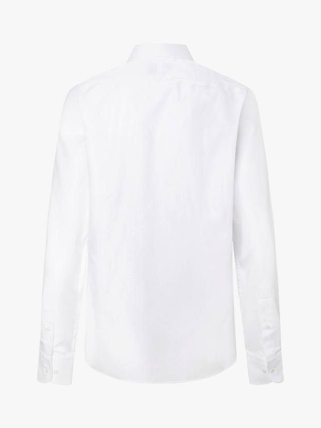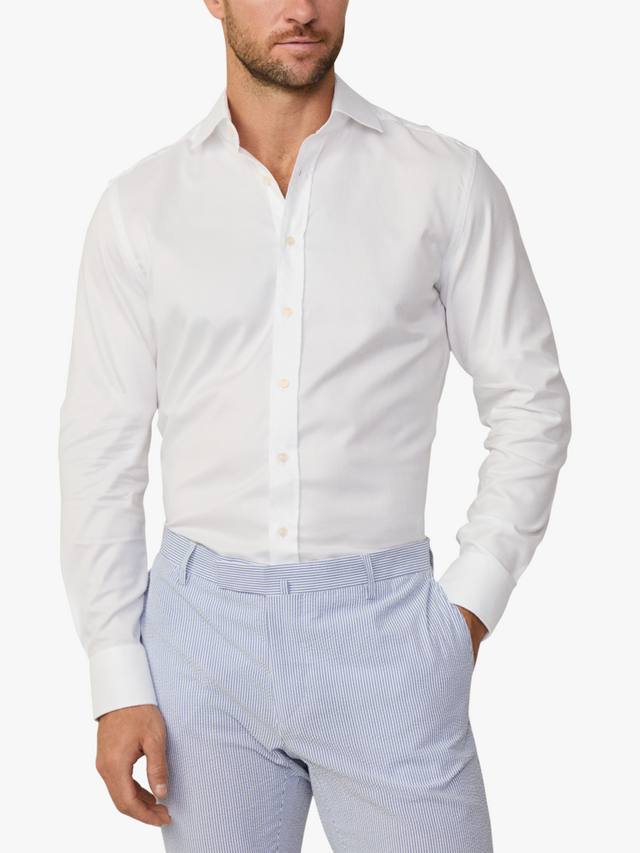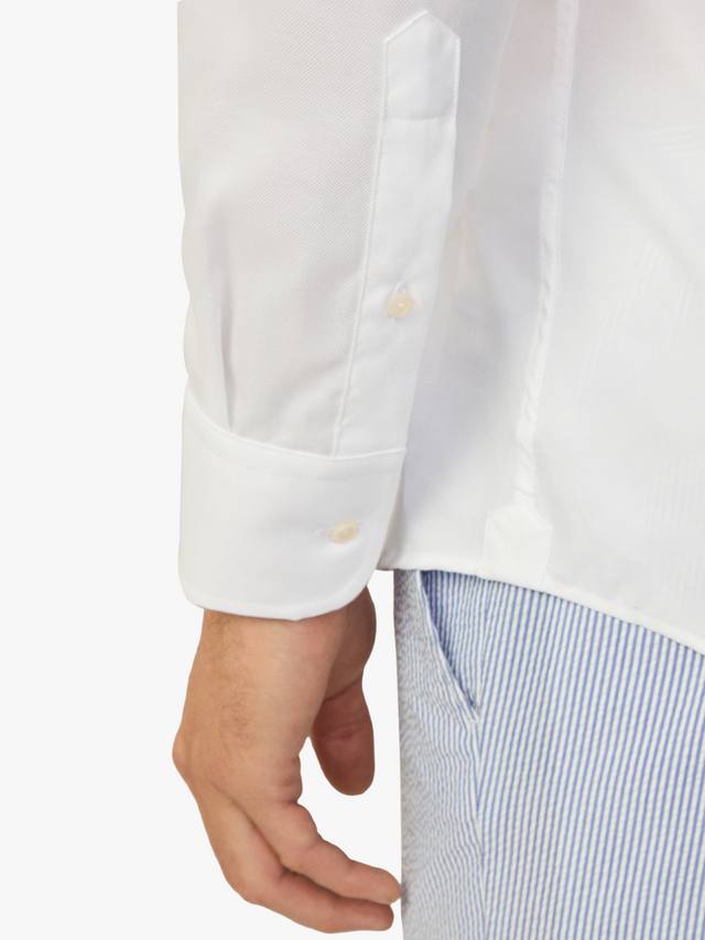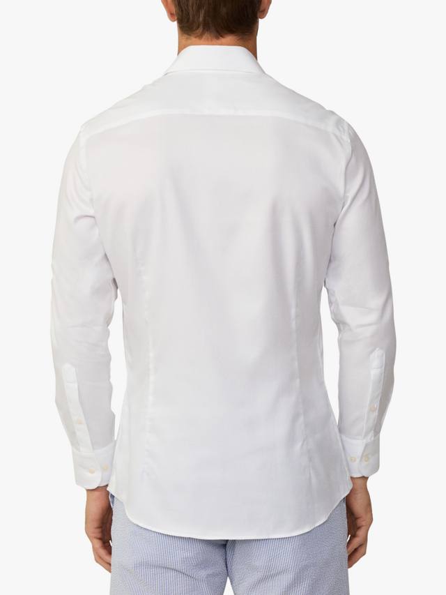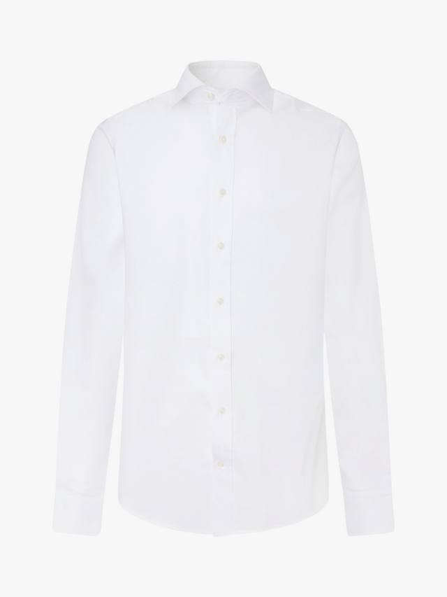 Однотонная рубашка для торжественных случаев облегающего кроя. Изготовлена из оксфордского хлопка с отложным воротником Knightsbridge, французской планкой, кокеткой сзади и длинными рукавами с манжетами на пуговицах.
