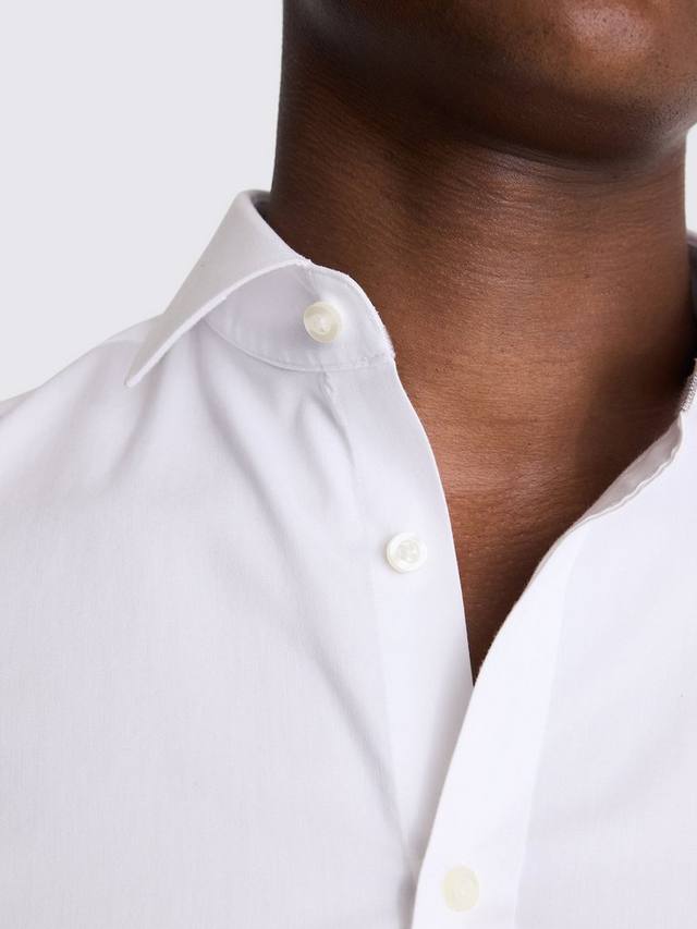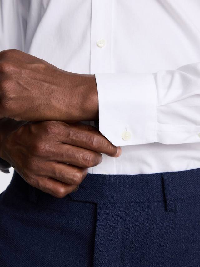 Приталенная рубашка Moss, сотканная из ткани с точной структурой Oxford, которая придает ткани более прочный вид, станет универсальным дополнением к вашим деловым встречам. Она представлена в белом цвете с контрастными элементами на внутренней стороне воротника и манжет.
