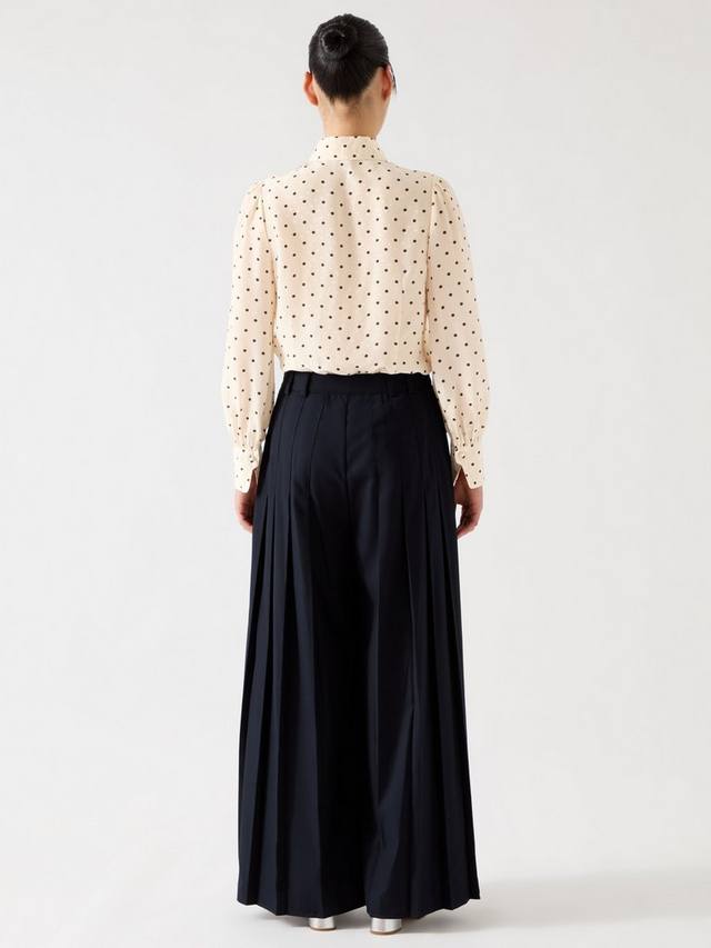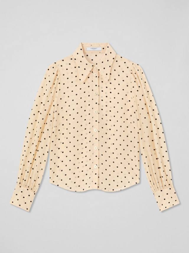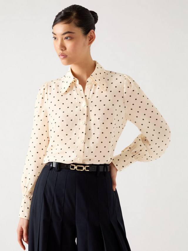 Блузка Sonya из смесового шёлка кремового и цвета слоновой кости украшена жаккардовым узором в горошек. Пуговицы кремового цвета создают изысканный образ и идеально сочетаются с брюками строгого кроя или юбкой с высокой талией. Идеально подходит для бранча или неформального офисного дня, сочетая стиль и комфорт.