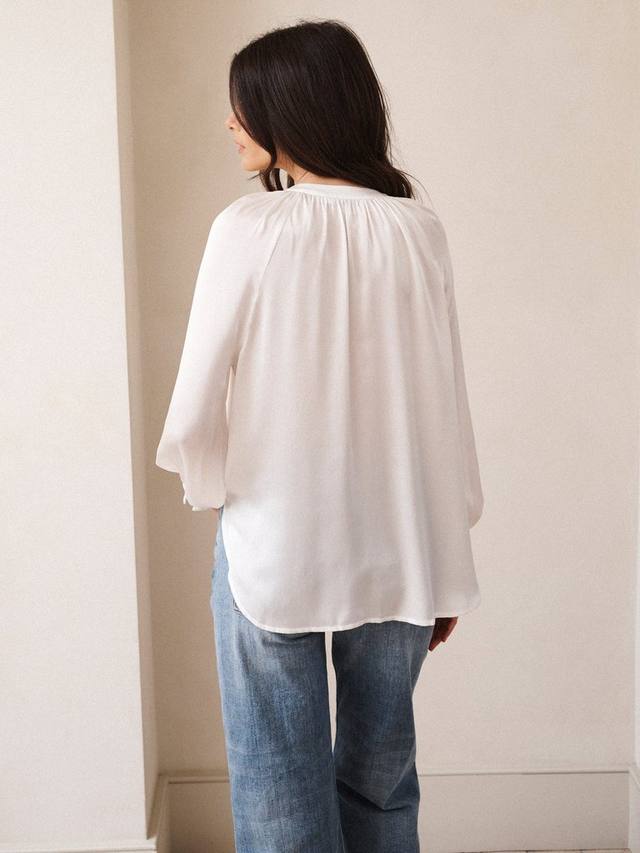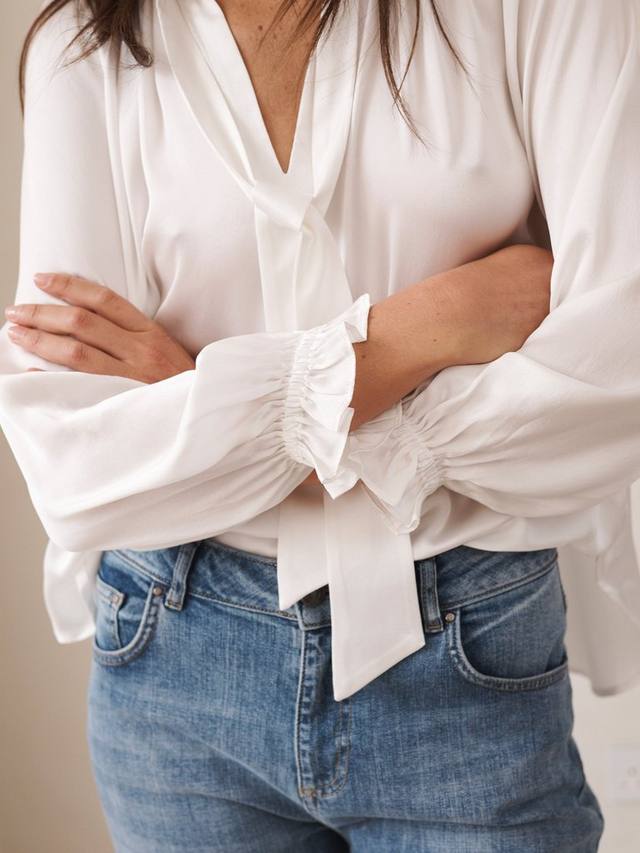 Элегантная рубашка из струящегося шелкового атласа – воплощение непринужденности и непринужденного стиля. Благодаря удобному галстуку, мягким сборкам и свободному силуэту, который не сковывает движений, она добавит изысканности любому образу. Дополните ее бархатными деталями для вечерних выходов или наденьте с джинсами для создания изысканного повседневного образа.