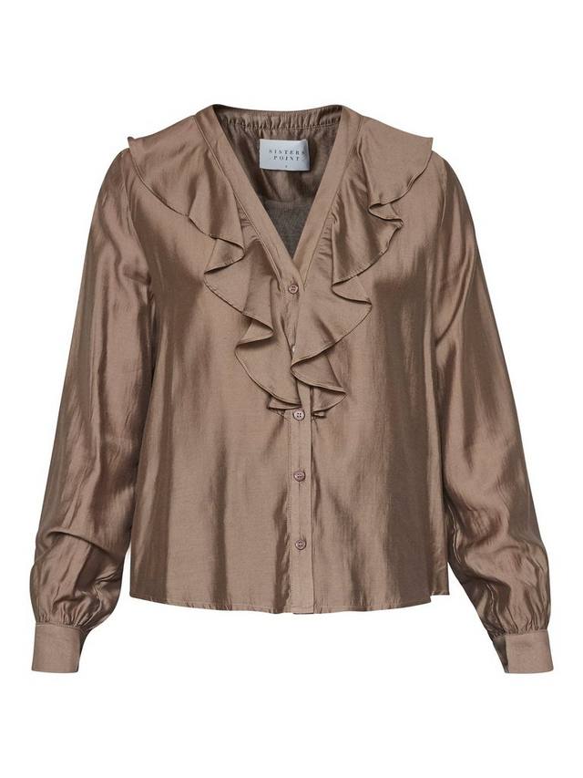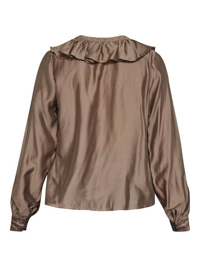 Velisa — женственная блузка с оборками вдоль V-образного выреза и спереди. Длинные рукава с манжетами на пуговицах.