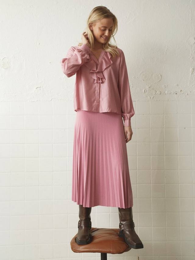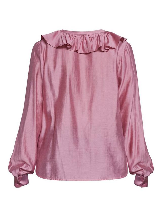 Velisa — женственная блузка с оборками вдоль V-образного выреза и спереди. Длинные рукава с манжетами на пуговицах.