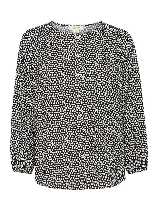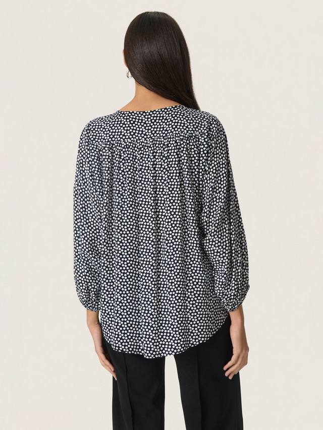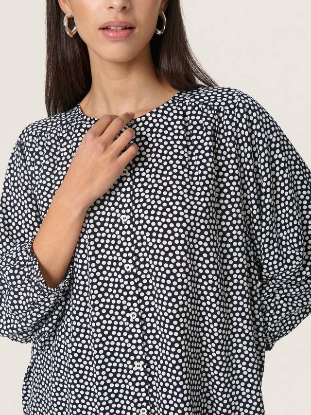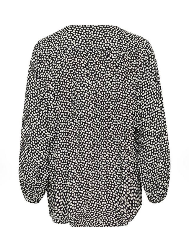 Эта объемная блузка с рукавами епископ идеально подходит для повседневных дней благодаря круглому вырезу, свободному крою и складкам с модным рисунком в горошек.