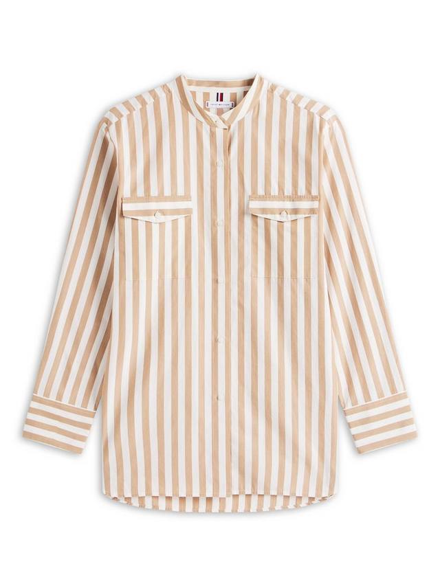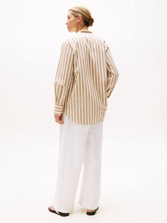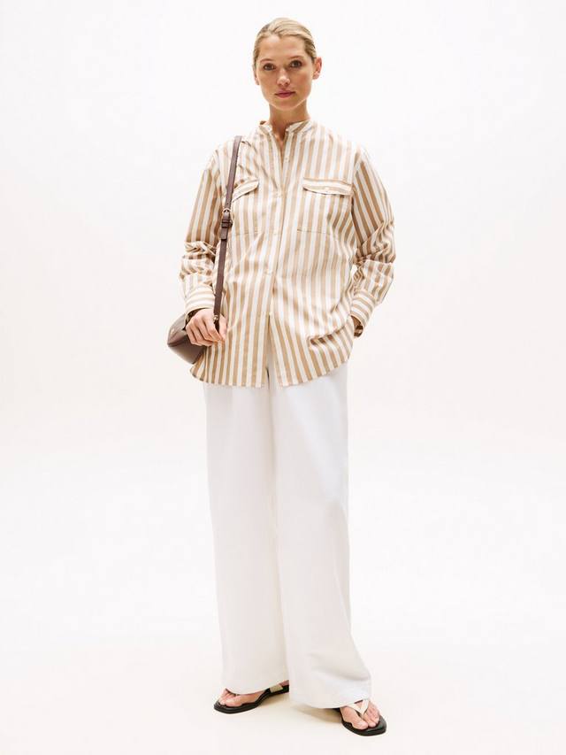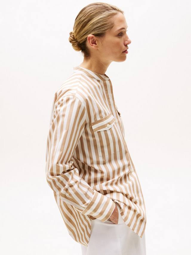 Без воротника эта рубашка из поплина выглядит современно, а регулируемые манжеты позволяют создавать различные образы.