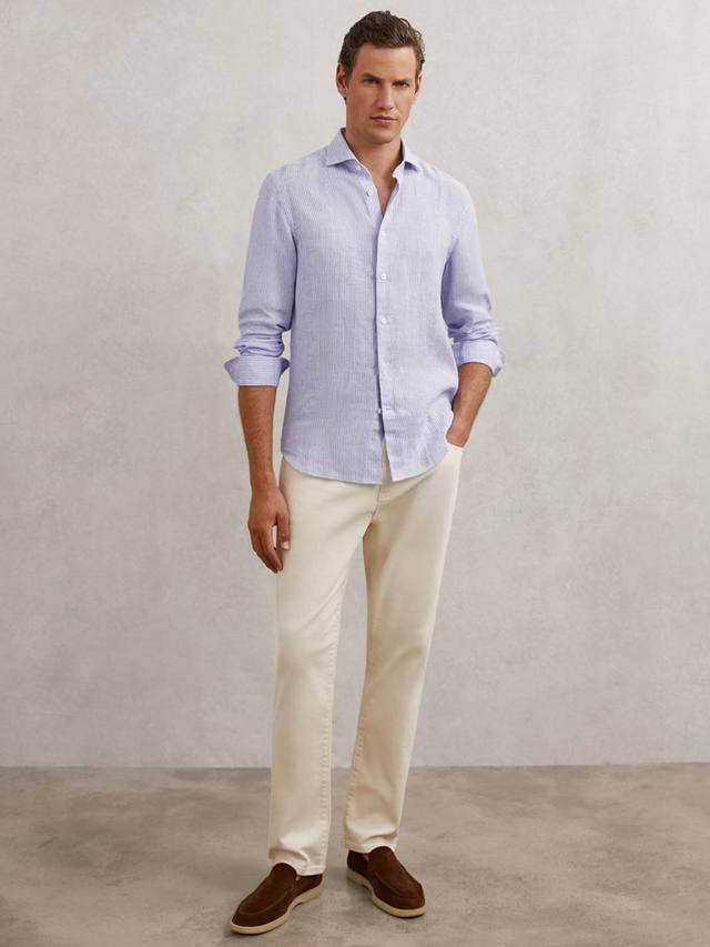 Полосатая рубашка, которая добавит свежести любому образу. Классический крой и чистый лен обеспечат прохладу и комфорт, а классический воротник обеспечит безупречный вид.