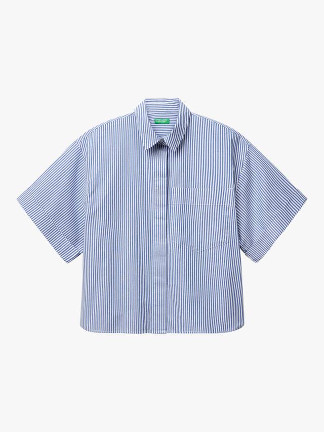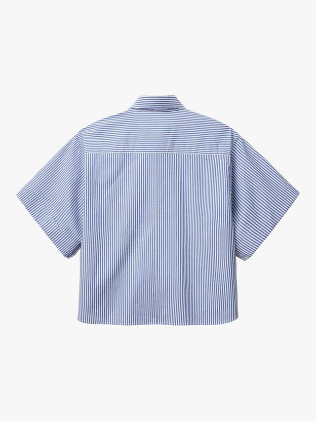 Рубашка с короткими рукавами и потайными пуговицами из окрашенного в полоску хлопка. Свободный крой, заостренный нагрудный карман. Кокетка сзади с двойной строчкой.